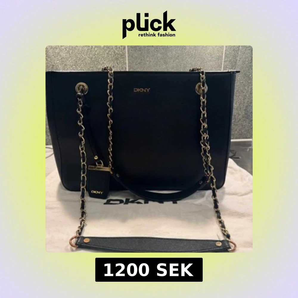 Elegant svart axelväska från DKNY med guldfärgade kedjedetaljer och dragkedja upptill. Väskan har en stilren design med DKNY-logga framtill och är perfekt för en chic look.