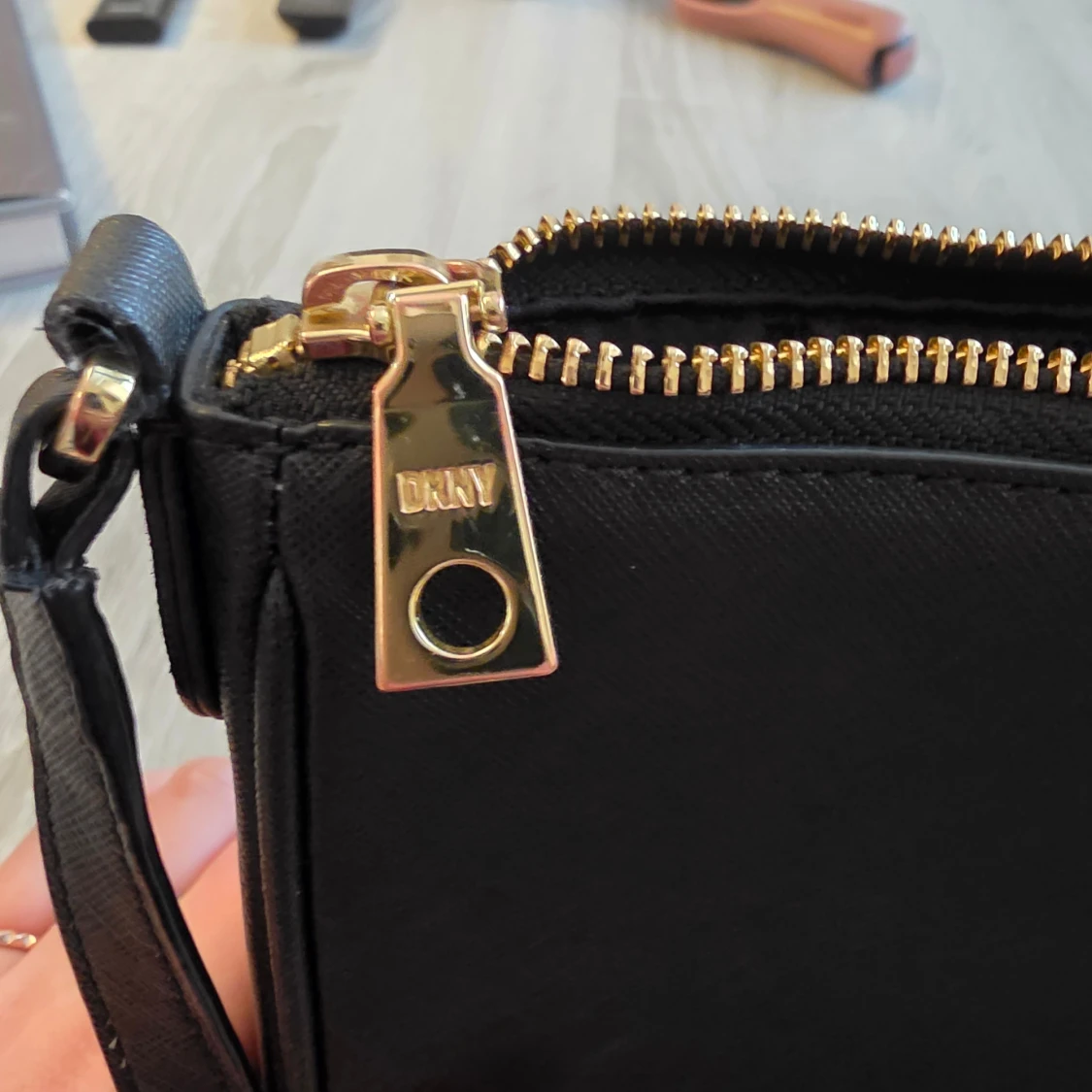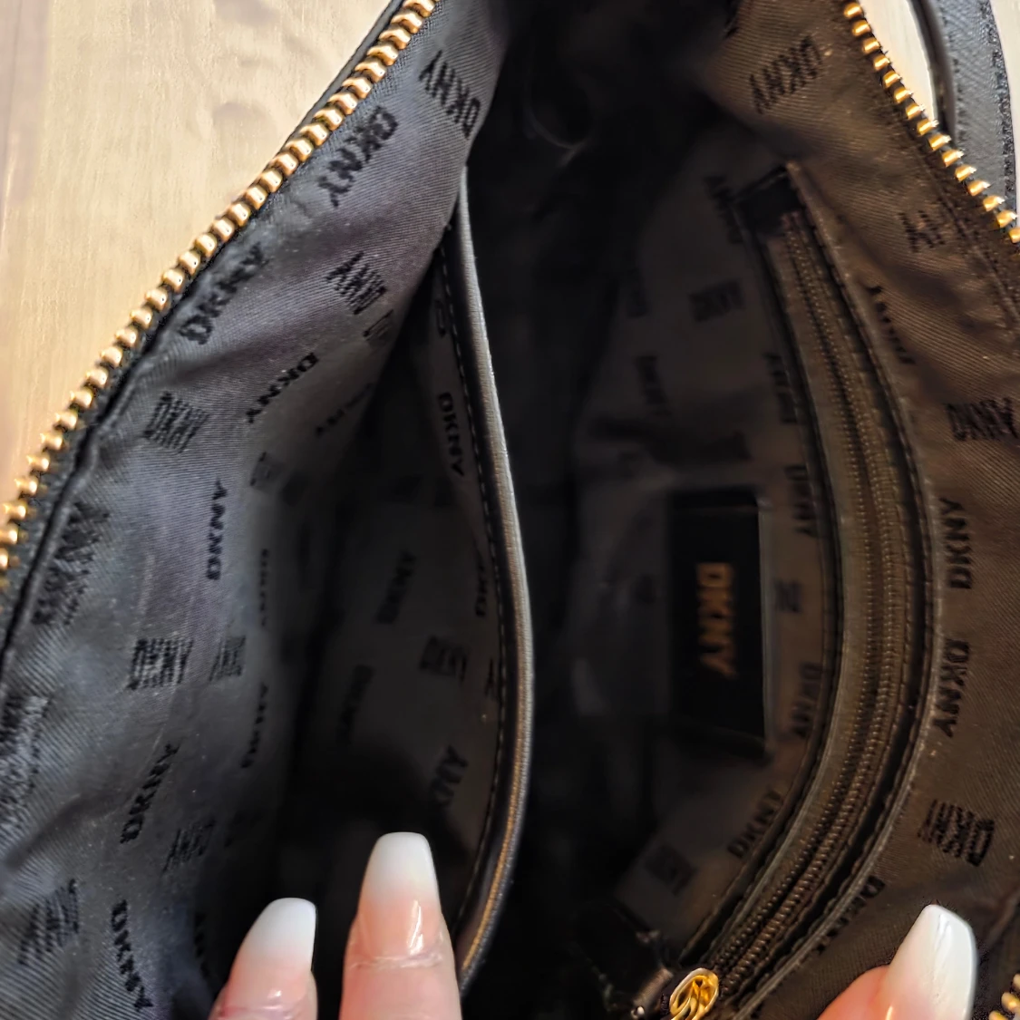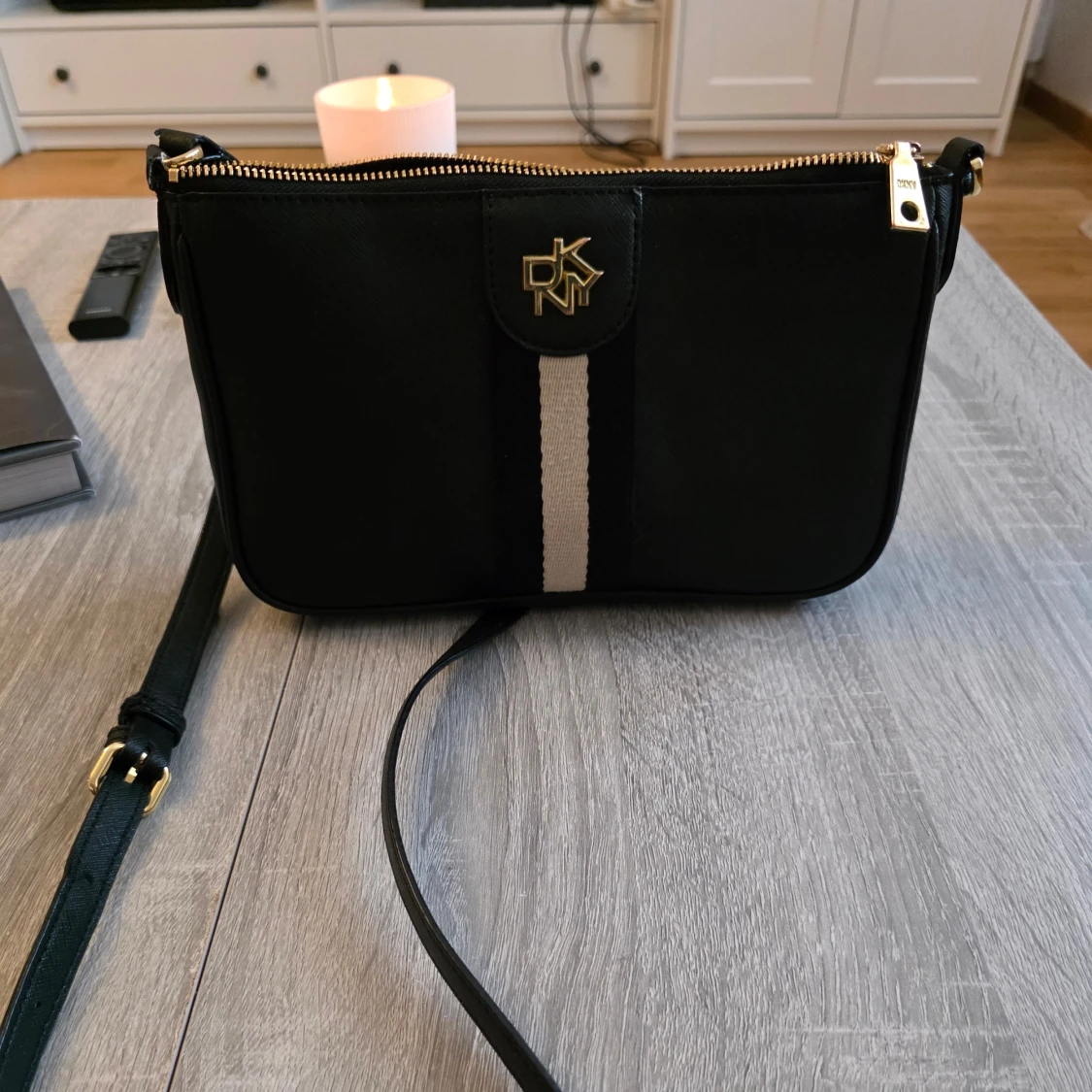 Svart axelväska från DKNY med guldfärgade detaljer och dragkedja. Väskan har en stilren design med en dekorativ rand i mitten och justerbar axelrem. I mycket gott skick samt original dust bag