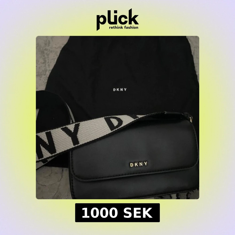 Säljer en svart axelväska från DKNY med bred axelrem i svart och vitt med logga. Väskan har ett stilrent och minimalistiskt utseende med DKNY i guld framtill. Perfekt för att bära det viktigaste.
