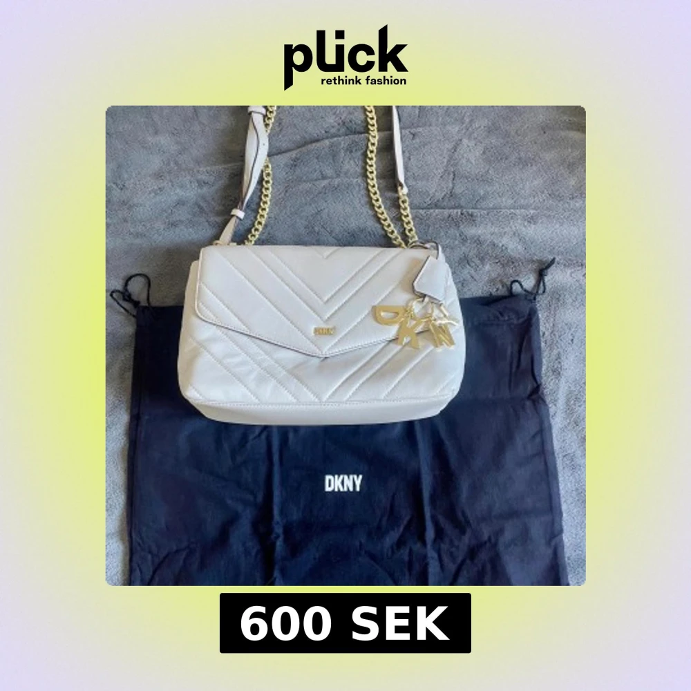 Snygg vit axelväska från DKNY i quiltat skinn med guldfärgade kedjedetaljer och justerbar axelrem. Väskan har dekorativa DKNY-bokstäver i metall och klassisk kuvertformad lock. Perfekt för dig som vill ha en stilren och trendig accessoar.