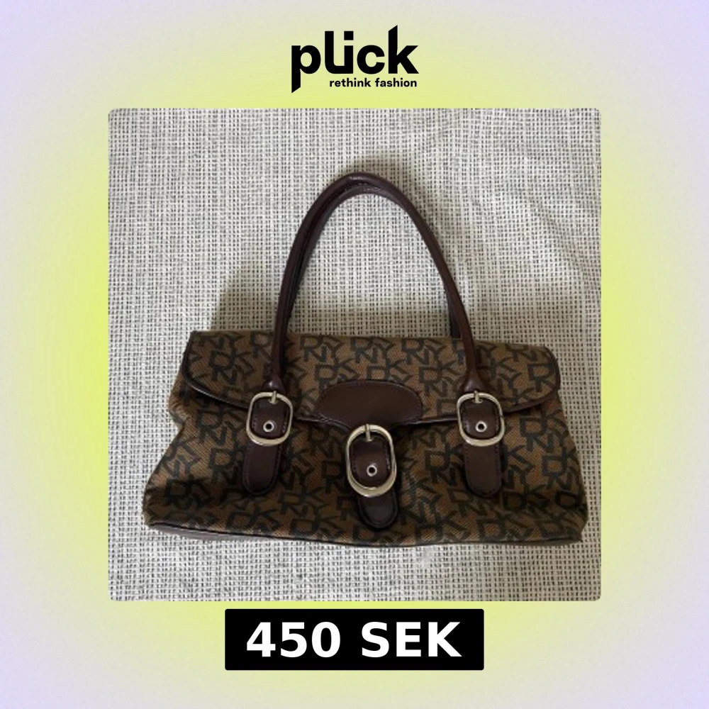 Säljer en brun handväska från DKNY med tydligt monogrammönster och mörkbruna detaljer. Väskan har tre dekorativa spännen framtill och två rejäla handtag. Perfekt för dig som gillar klassisk och tidlös design. I bra skick