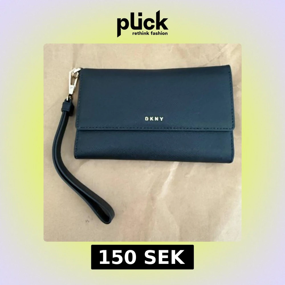 Snygg svart plånbok från DKNY i stilren design med guldfärgade detaljer och avtagbar handledsrem. Plånboken har flera kortfack, dragkedjefack på baksidan och tryckknappsstängning. Perfekt för att hålla ordning på kort och kontanter.