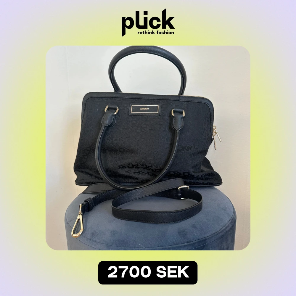 DKNY väska, svart tyg med guld detaljer medföljande axelbandsrem. Original. Knappt använd. Lite slitage på metalltassarna undertill. Fråga gärna om fler bilder.
