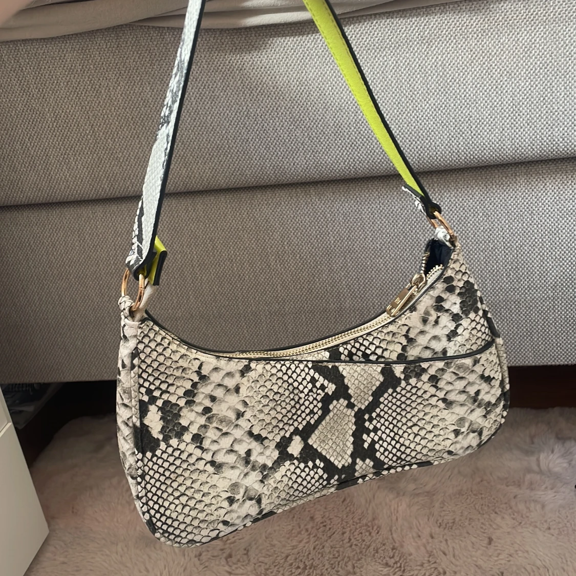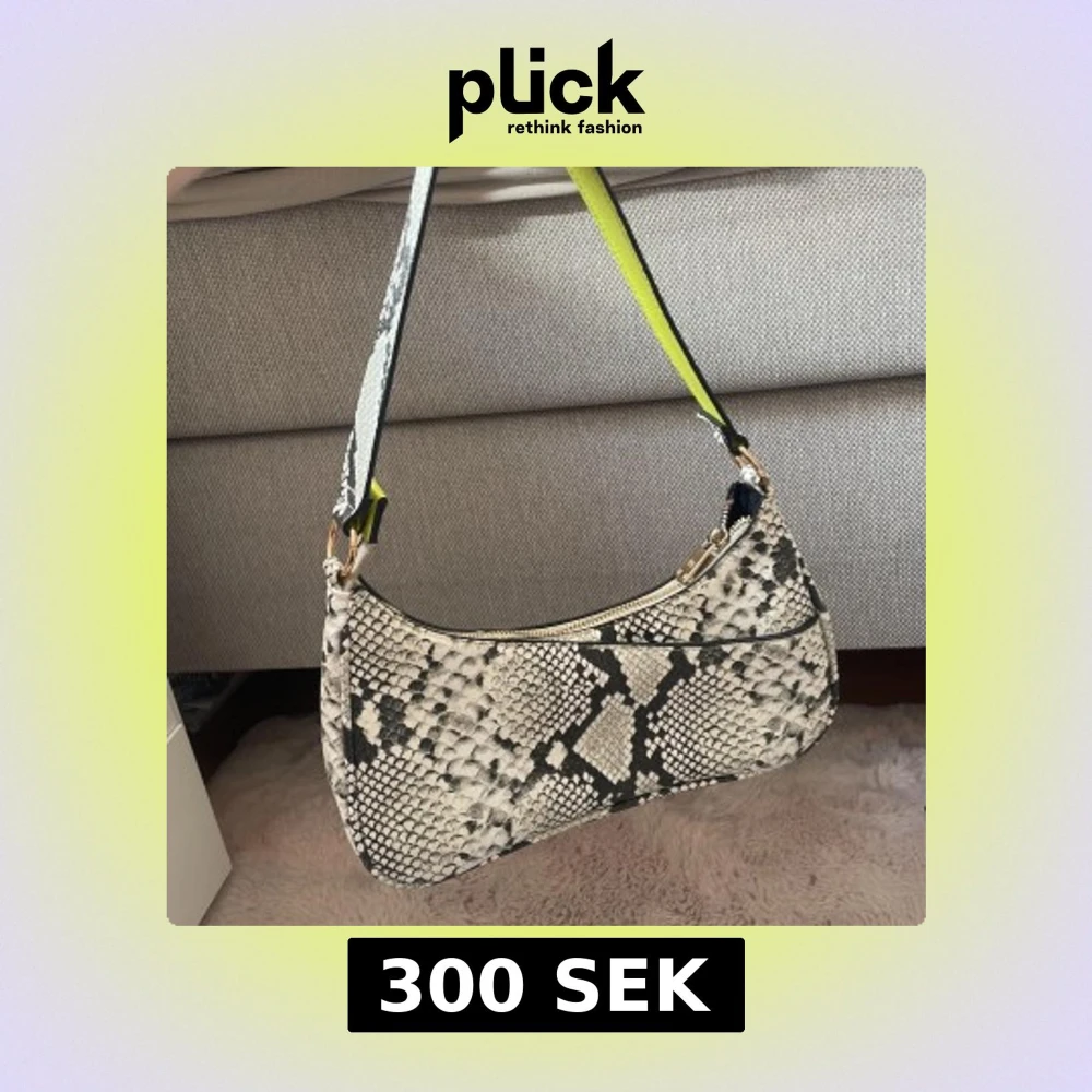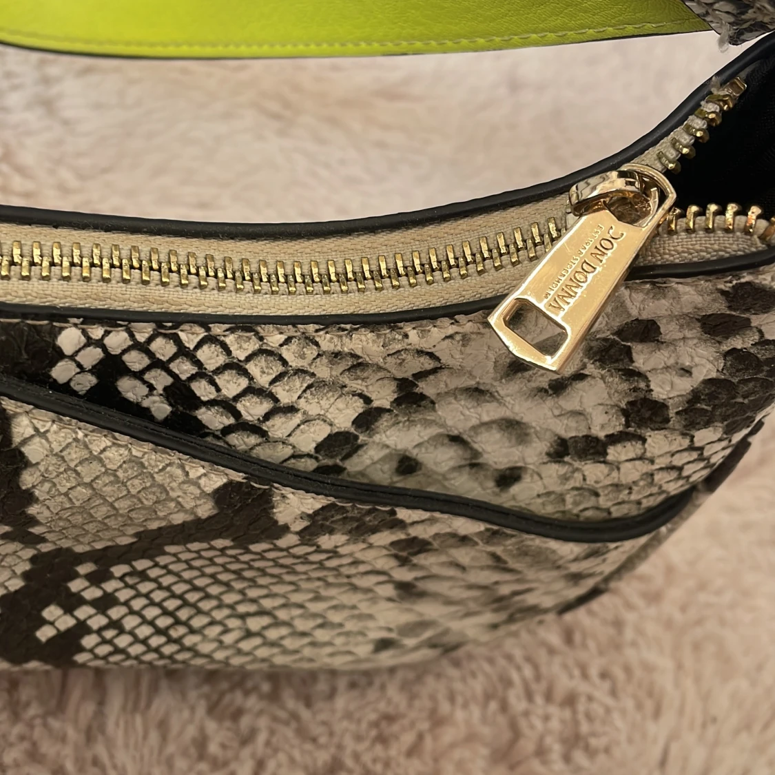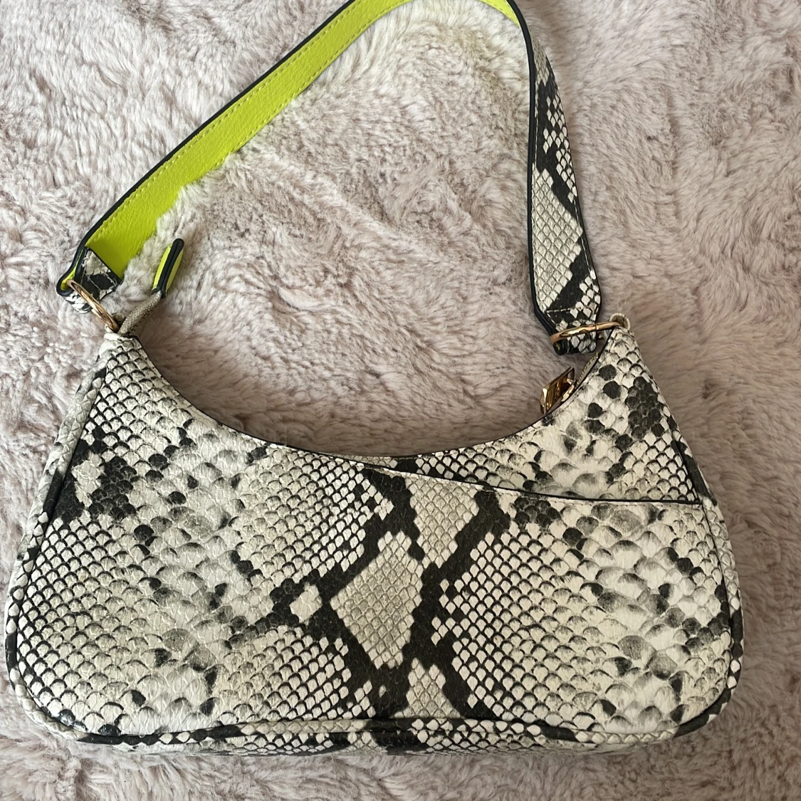 Säljer en snygg axelväska från Don Donna med ormmönster i svart och vitt. Väskan har en bred axelrem med cool limegrön insida och guldfärgad dragkedja.