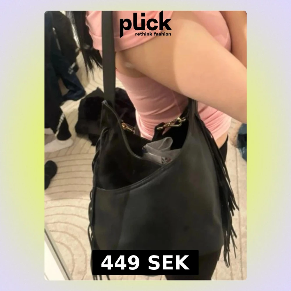 Säljer en svart axelväska i skinnimitation med långa fransar på sidorna. Väskan har en enkel, rundad form och justerbar axelrem. Perfekt för dig som vill ha en stilren men ändå trendig väska till vardagslooken. Superfin😊 Använd gärna köp nu❤️