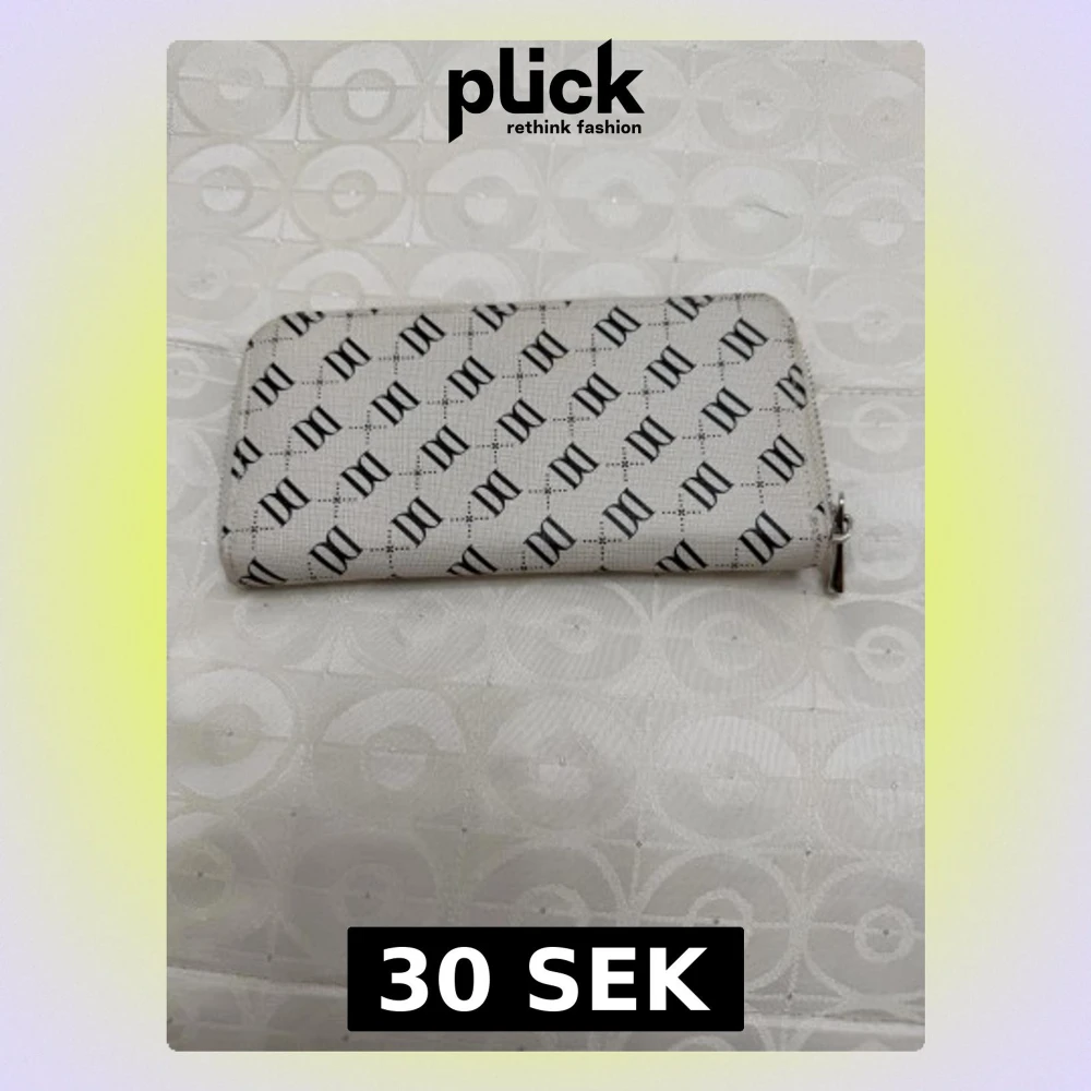 Snygg vit plånbok från Don Donna med svart logomönster över hela ytan. Plånboken har dragkedja runtom och flera fack för kort, sedlar och mynt.