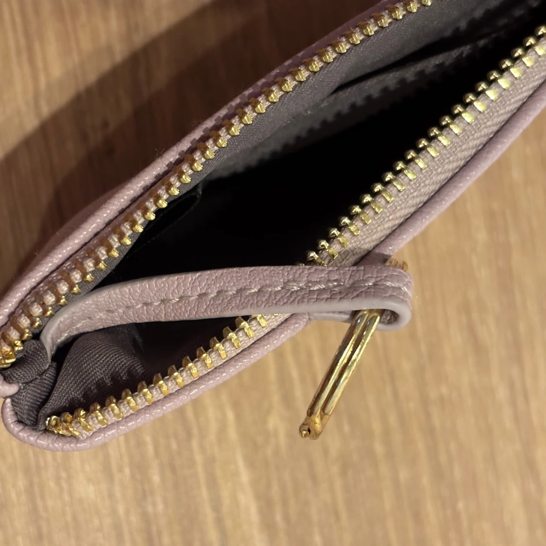 Snygg beige plånbok i äkta skinn med guldfärgad dragkedja och logga framtill. Perfekt storlek för kort och mynt, med en praktisk nyckelring i guld. Stilren och enkel design som passar i fickan eller väskan.