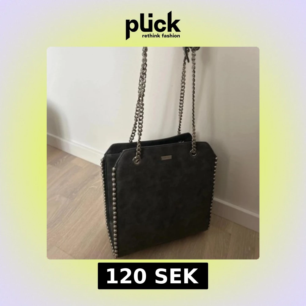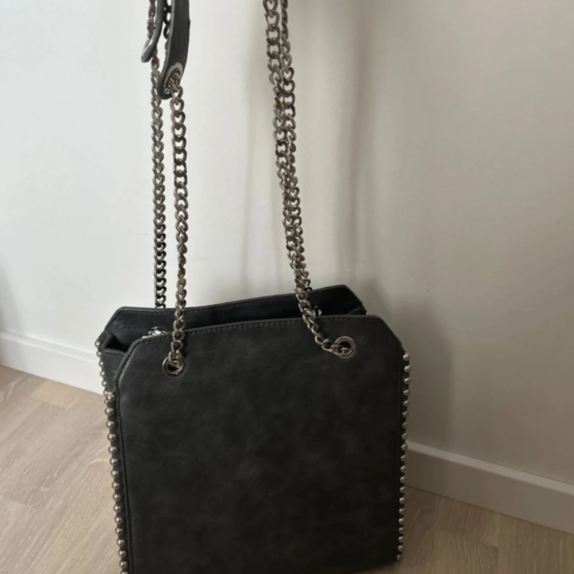 Snygg svart axelväska från Don Donna i skinnimitation med silverfärgade kedjor som axelrem och coola nitar längs kanterna. Väskan har en fyrkantig form och stilren look.