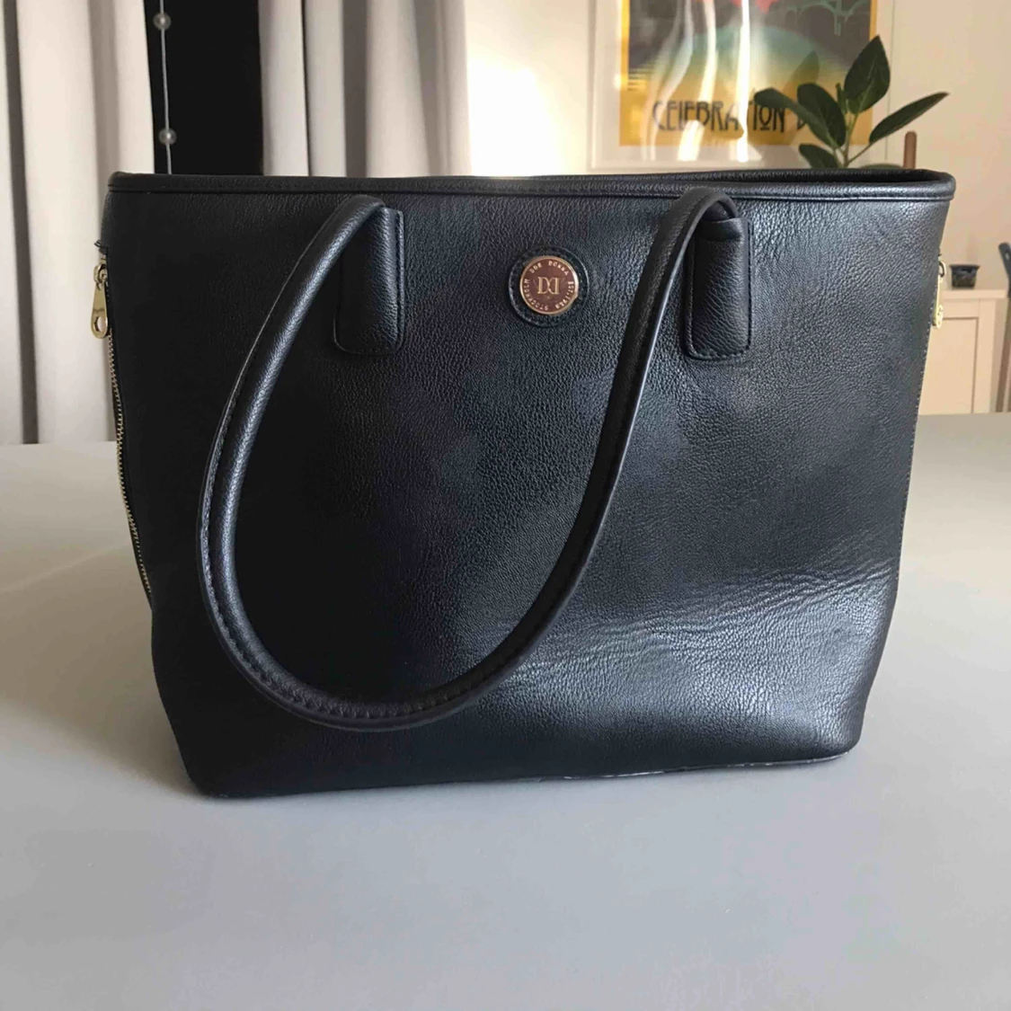 En snygg väska i läderimitation. Använd som skolväska och är perfekt i storlek för mappar och dator. Trots att den är väl använd är den i väldigt fint skick. Små fläckar i innerfodret, kan ses på bild två. Köpt för 599kr. (Köparen står för frakten)