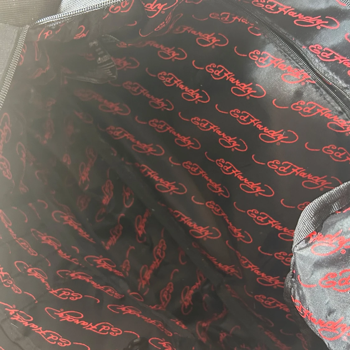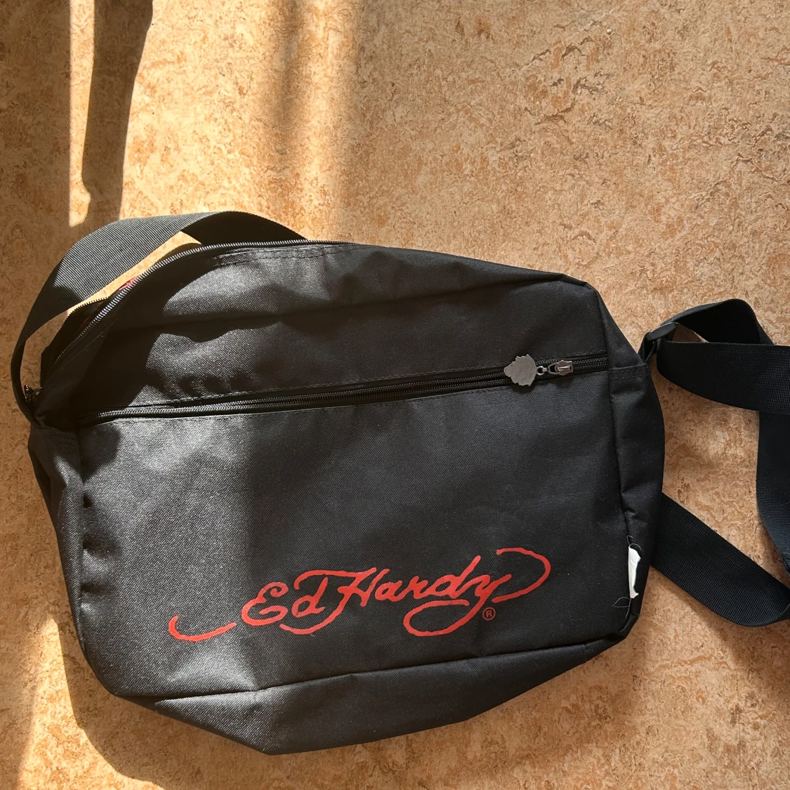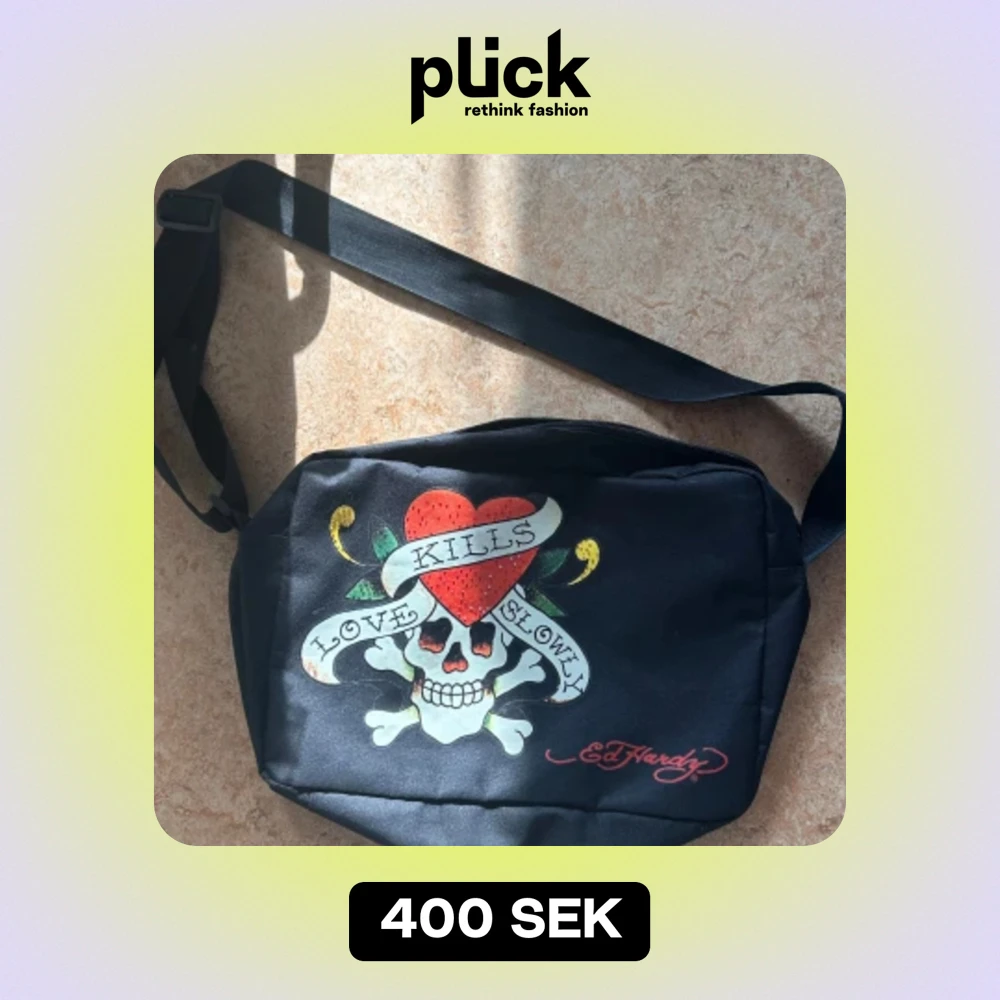 Hej säljer min EdHardy väska då den ej kommer till användning mer. Lite små rhinestones saknas på framsidan men märks knappt annars allt bra skick!