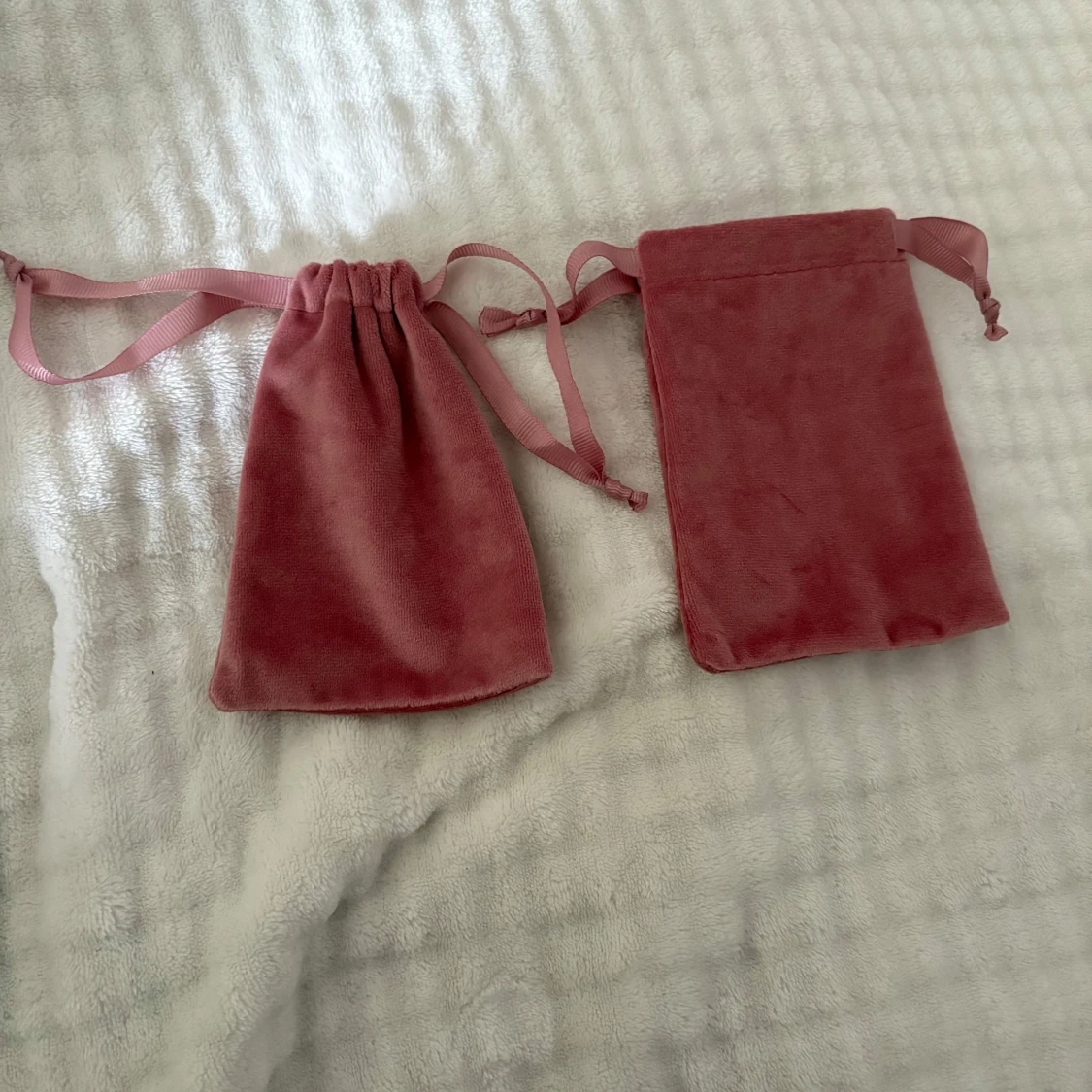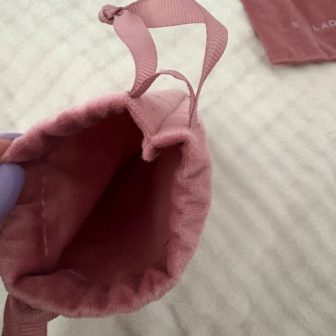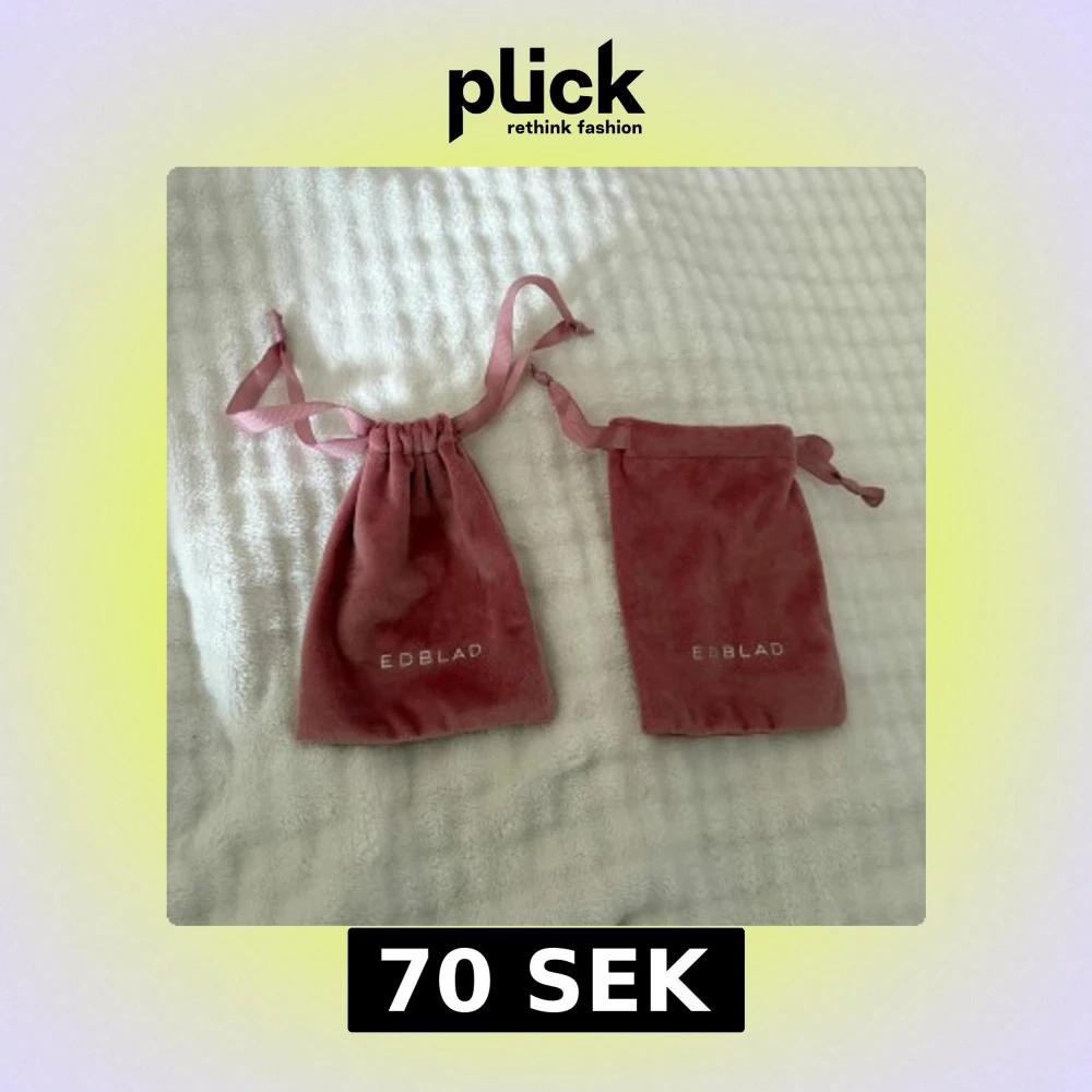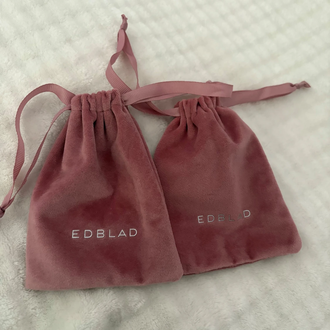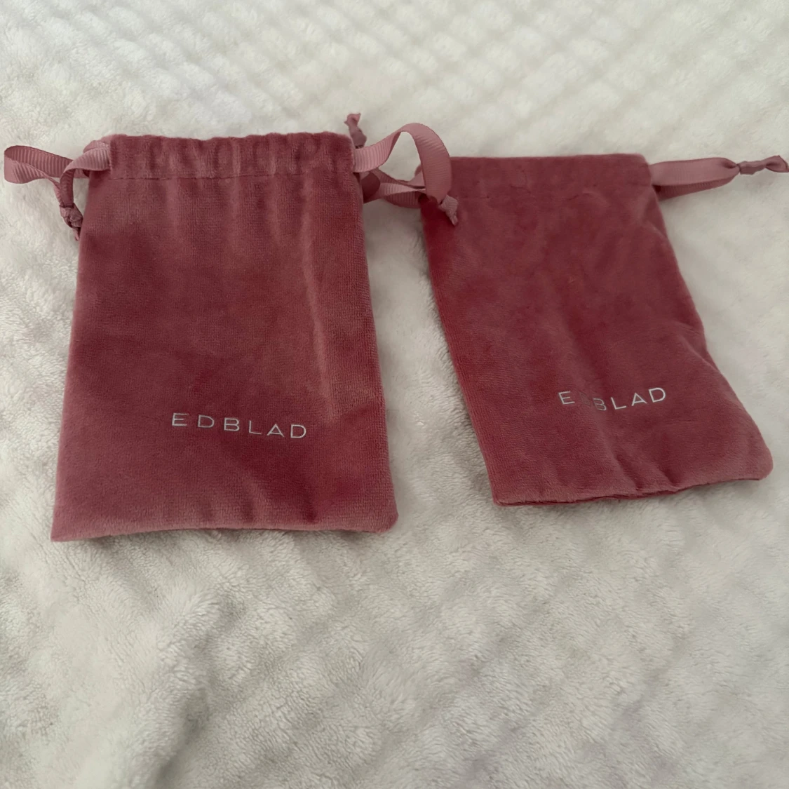 Två mjuka rosa sammetspåsar från Edblad med dragsko i matchande band. Perfekta för smycken eller småprylar, med stilren logga framtill. Snygg accessoar att ha i väskan eller på resan.