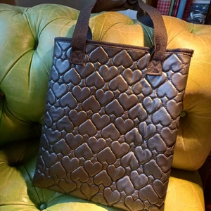 En väska i påsform med skitsnyggt hjärt-mönster i fuskskinn. Ovanlig och snygg. Fodrad med vinrött tyg. Använd några få gånger, perfekt skick. 60 kr plus eventuell frakt.