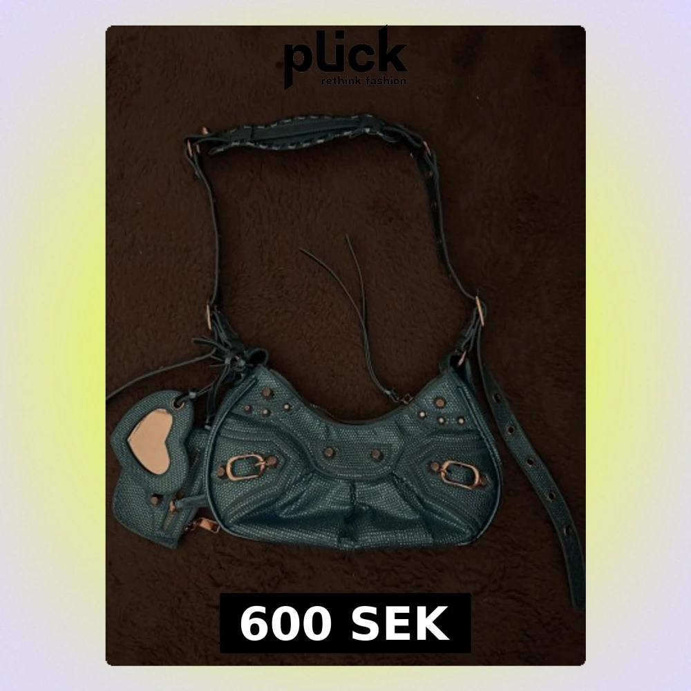 Cool blå axelväska med små silvriga nitar och snygga metalldetaljer. Väskan har en justerbar rem, dragkedja upptill och en liten ficka med dragkedja framtill. Extra charmig med ett hjärtformat spegelhänge. Materialet är syntet med glittrig finish. Den är ny och ej använd. Den är köpt på Ego för ca 800kr och säljer för 600kr. !!PRIS KAN DISKUTERAS!!