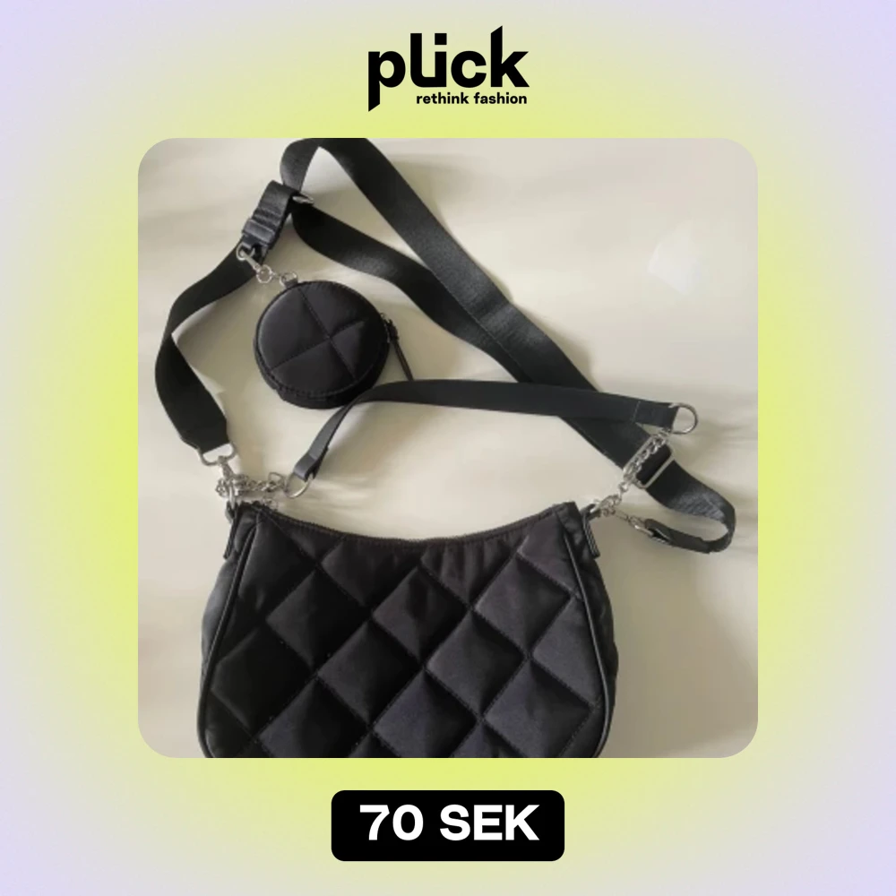 En svart axelväska med en liten väska vid axel bandet med bra skick. Man kan dessutom ta bort det långa bandet så att den blir till en liten axel väska. (Pris kan diskuteras)
