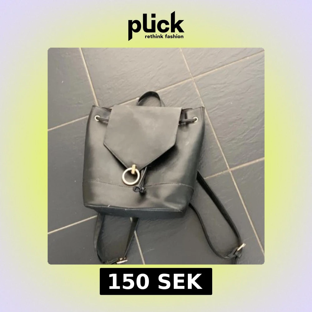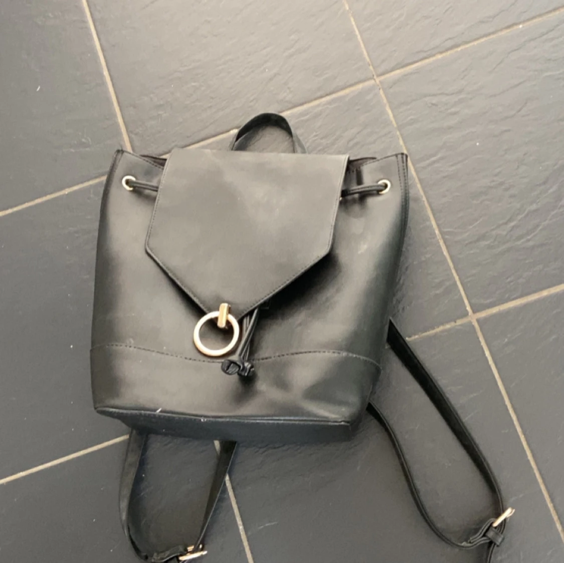 Snygg svart ryggsäck i skinnimitation med justerbara axelband och lock med dekorativ guldfärgad ring. Praktisk och stilren modell med dragsko under locket, perfekt för att bära dina grejer till skolan eller stan.