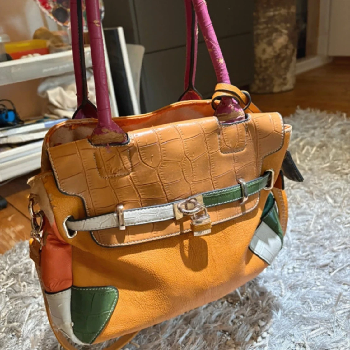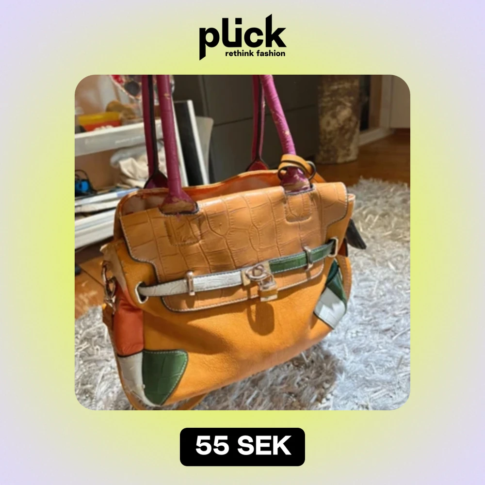 En stor fin färgglad handväska! Den har många fack som delar även upp väskan på mitten. Fina detaljer, olika mönster och färger