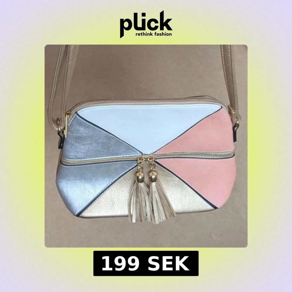 HELT OANVÄND VÄSKA. Säljer en snygg axelväska i syntet med geometriskt mönster i vitt, silver, guld och rosa. Väskan har justerbar rem, dragkedja och två dekorativa tofsar framtill. Insidan är fodrad med coolt snirkligt tyg och har praktiska fack för småsaker och även ett fack med dragkedja.
