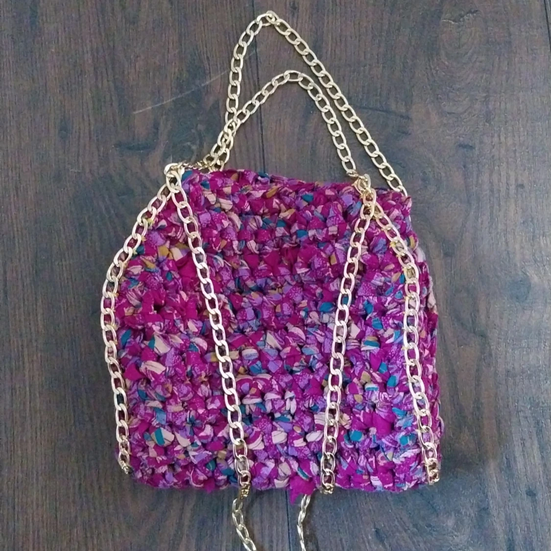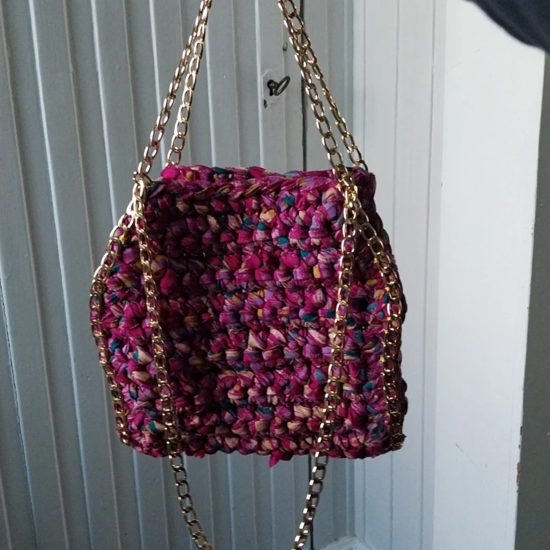 Säljer en unik och färgglad virkad väska med guldiga kedjor. Väskan har en härlig mix av färger som rosa, blå och lila, vilket ger den ett livfullt utseende. Perfekt för att liva upp vilken outfit som helst!
