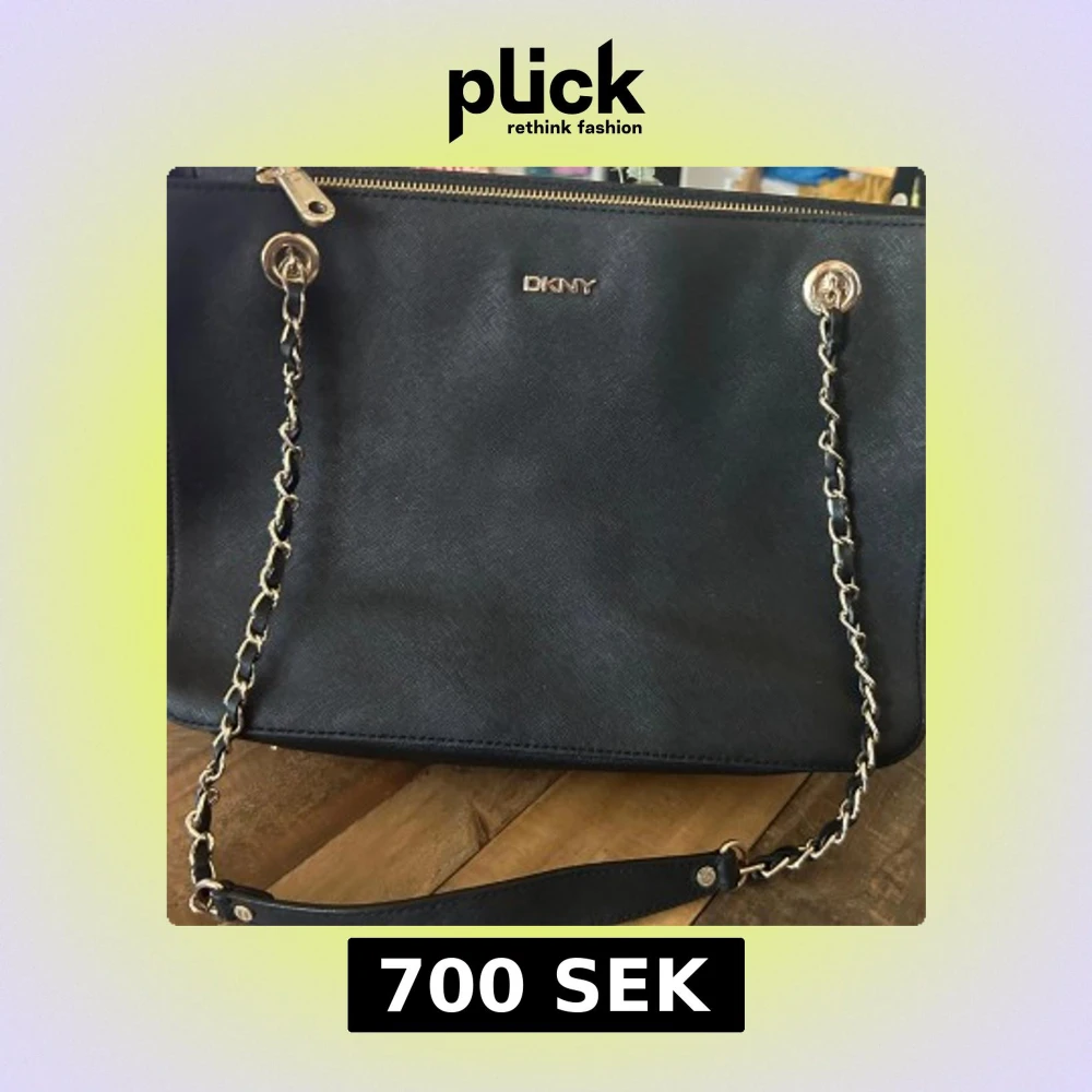 Snygg svart axelväska från DKNY i skinn med guldfärgade kedjedetaljer och dragkedja upptill. Väskan har ett rymligt foder med DKNY-logga och flera innerfack, perfekt för att hålla ordning på dina grejer. Klassisk och stilren design med exklusiv känsla.Mått: 34*12*24cm