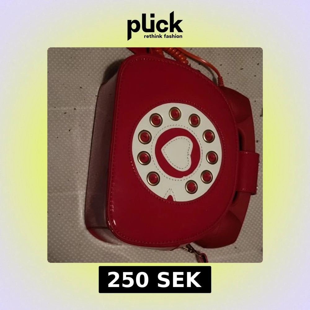 Unik röd axelväska i form av en retro telefon med ett hjärtmönster på framsidan. Väskan har en dragkedja och en justerbar axelrem. Perfekt för att ge en lekfull touch till din outfit.