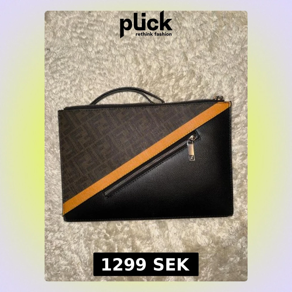 Snygg kuvertväska från Fendi i svart och brun skinn med klassiskt Fendi-mönster och en diagonal gul detalj på framsidan. Väskan har en silverfärgad dragkedja och ett litet handtag upptill. Perfekt för att bära det viktigaste med stil.