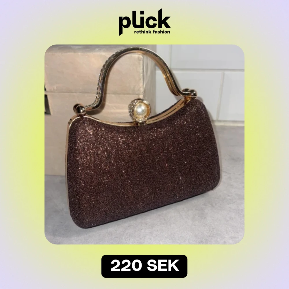Snygg brun glittrig handväska perfekt för fest! Den har en elegant pärldetalj på låset och ett glittrande handtag. Väskan kommer med en avtagbar kedja så du kan bära den som axelväska också. Perfekt accessoar för att lysa upp din outfit! Oanvänd köpt till bröllopsfest