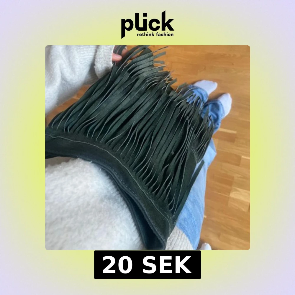 Grön väska med fransar. Ett fack har gått sönder (se sista bild).