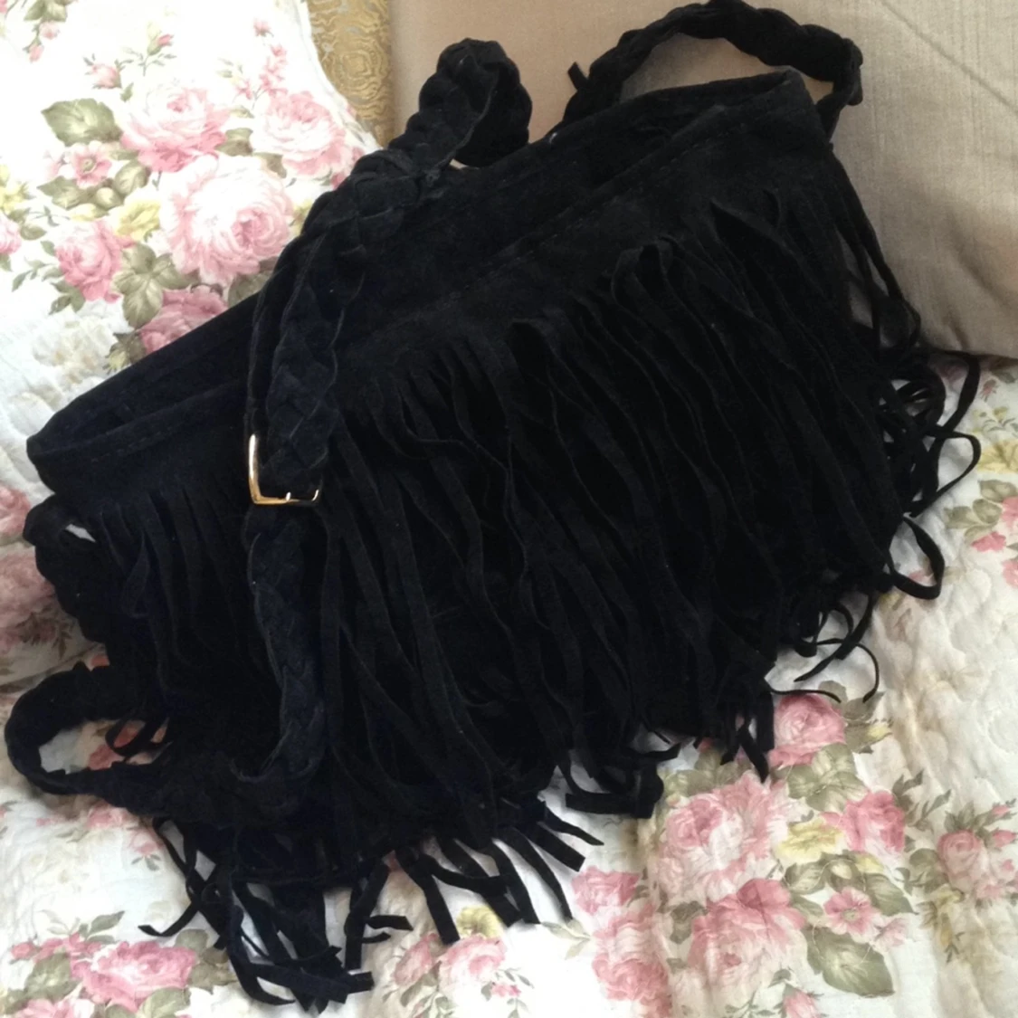 Svart fransväska i mockaimitation. Axelremmen är flätad och har guldigt spänne. Bredd: 34 cm Höjd: 22 cm Djup (botten): 11 cm