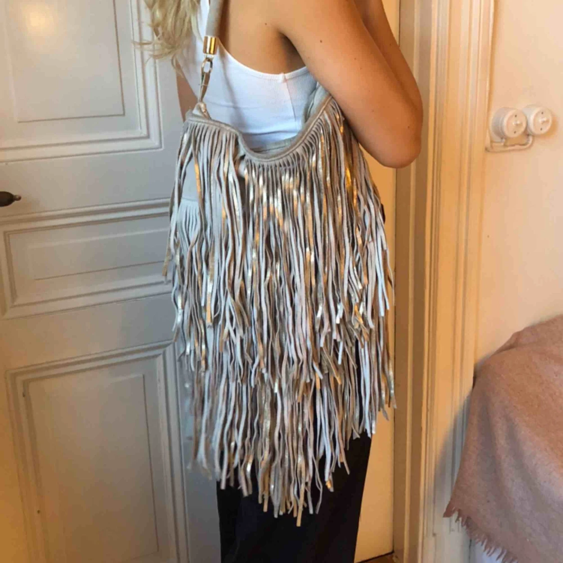 Hm mockaväska i beige och guld med fransar i fint skick.