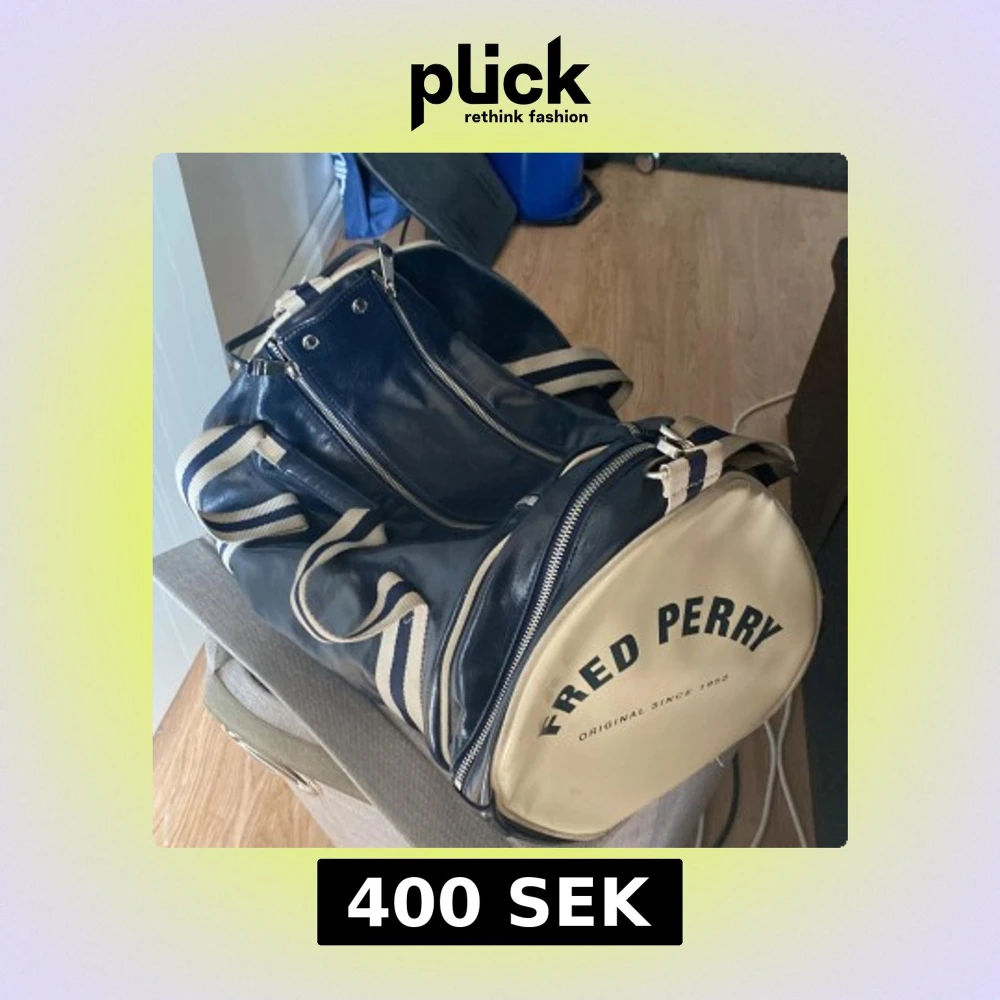 Snygg sportväska från Fred Perry i marinblått och beige med klassiska ränder på axelremmen. Väskan har rund form, dragkedjor och logga på sidan. Perfekt för gymmet eller resan, tillverkad i syntetmaterial med retrovibbar. Vill bli av med väskan. Snabb affär prioriteras. mvh Anton