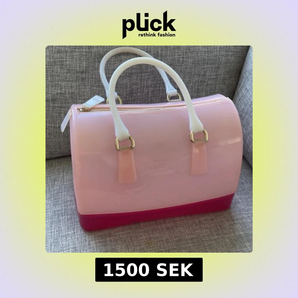 Säljer en snygg handväska från det italienska märket Furla. Modellen heter Candy bag och väskan lanserades ursprungligen under Milan Fashion Week SS22. Furla Candy Bag är känd för sin glansiga, geléliknande design har ljusrosa kropp, vit handtag och en starkt rosa botten. Väskan har guldfärgade detaljer och dragkedja upptill. Perfekt storlek för att få plats med allt du behöver och ger en färgklick till din outfit.