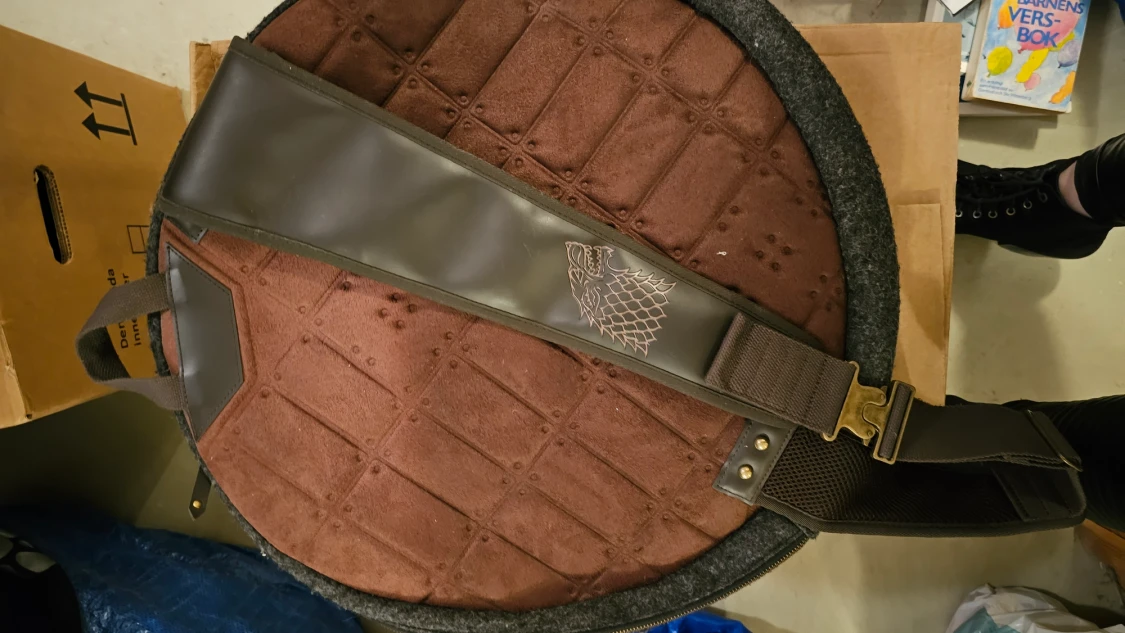 Köpt för 1000:- på Gamestop för några år sedan, men mest hängt på väggen. Skitcool väska som ser ut som en sköld med hårt skal. Fickor för laptop/böcker etc. Remmen är graverad med Starks varg och har en häftig låshasp så man kan öppna den framifrån.