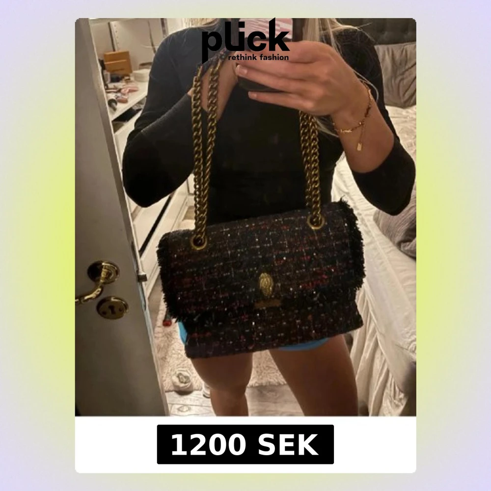Säljer en snygg axelväska från Kurt Geiger, modell The Kensington. Väskan är i mörk tweed med inslag av rött, blått och guld samt glittriga detaljer. Kedjerem i guld och cool emblem på locket. Perfekt storlek för det viktigaste och ger en trendig touch till din outfit.