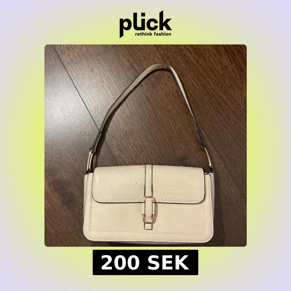 Säljer en snygg beige axelväska med krokodilpräglat mönster och guldfärgat spänne framtill.