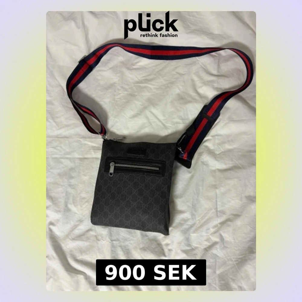 Snygg svart axelväska från GG med klassiskt GG-mönster och en bred, randig axelrem i blått och rött. Väskan har en praktisk dragkedja framtill och är tillverkad i slitstark syntet med detaljer i skinn. Perfekt för dig som vill ha en stilren och lyxig väska.