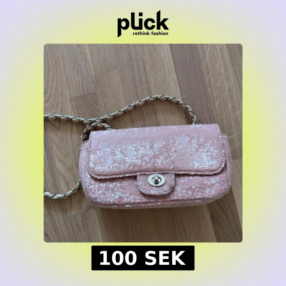 Söt rosa axelväska med glittriga paljetter och kedjerem i silver och beige. Väskan har ett klassiskt lock med vridknäppe och är perfekt för dig som vill sticka ut lite extra.