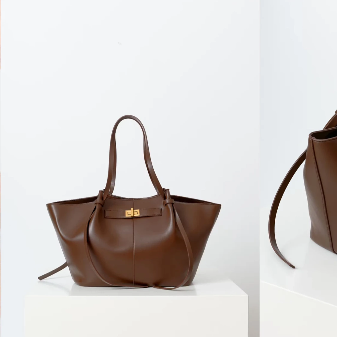 Snygg brun axelväska i skinn med elegant gulddetalj på framsidan. Väskan har långa handtag och en stilren design som passar perfekt för alla tillfällen. Den rymliga insidan gör den praktisk för dagligt bruk.