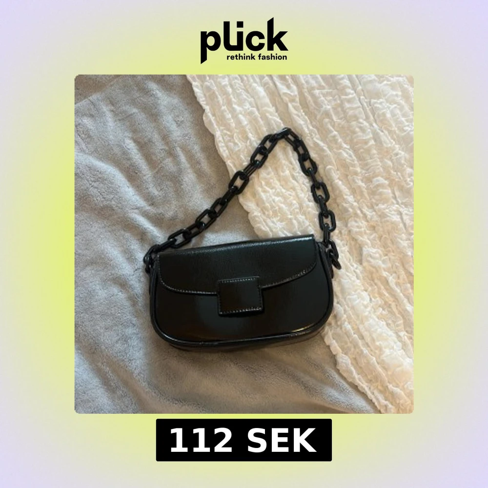 Snygg svart axelväska i glansigt syntetmaterial med bred kedja som handtag. Väskan har en stilren design med lock och fyrkantigt spänne framtill. Perfekt accessoar för att lyfta din outfit.