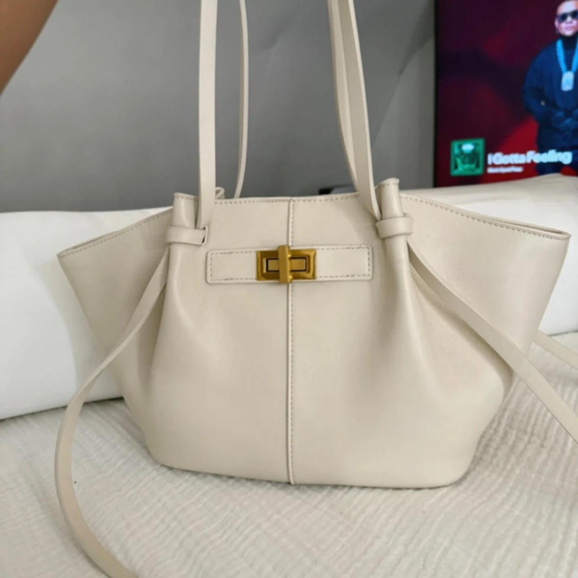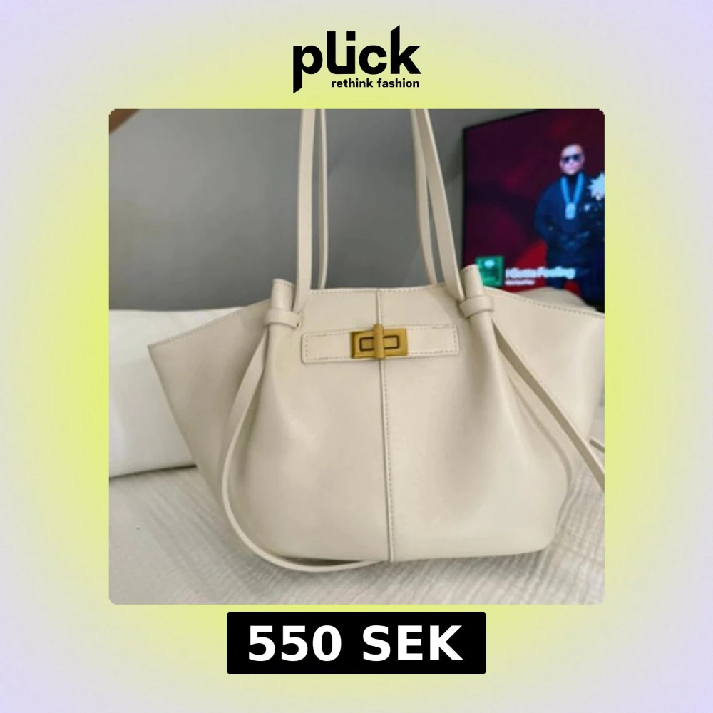 Snygg vit handväska med stilren form och guldfärgat spänne framtill. Väskan har långa axelband och rymligt innerfack med dragkedja. Materialet är slätt syntet och designen är enkel men trendig, perfekt för dig som gillar minimalistisk stil. Storleken ser ni på sista bilden. Aldrig använd!!