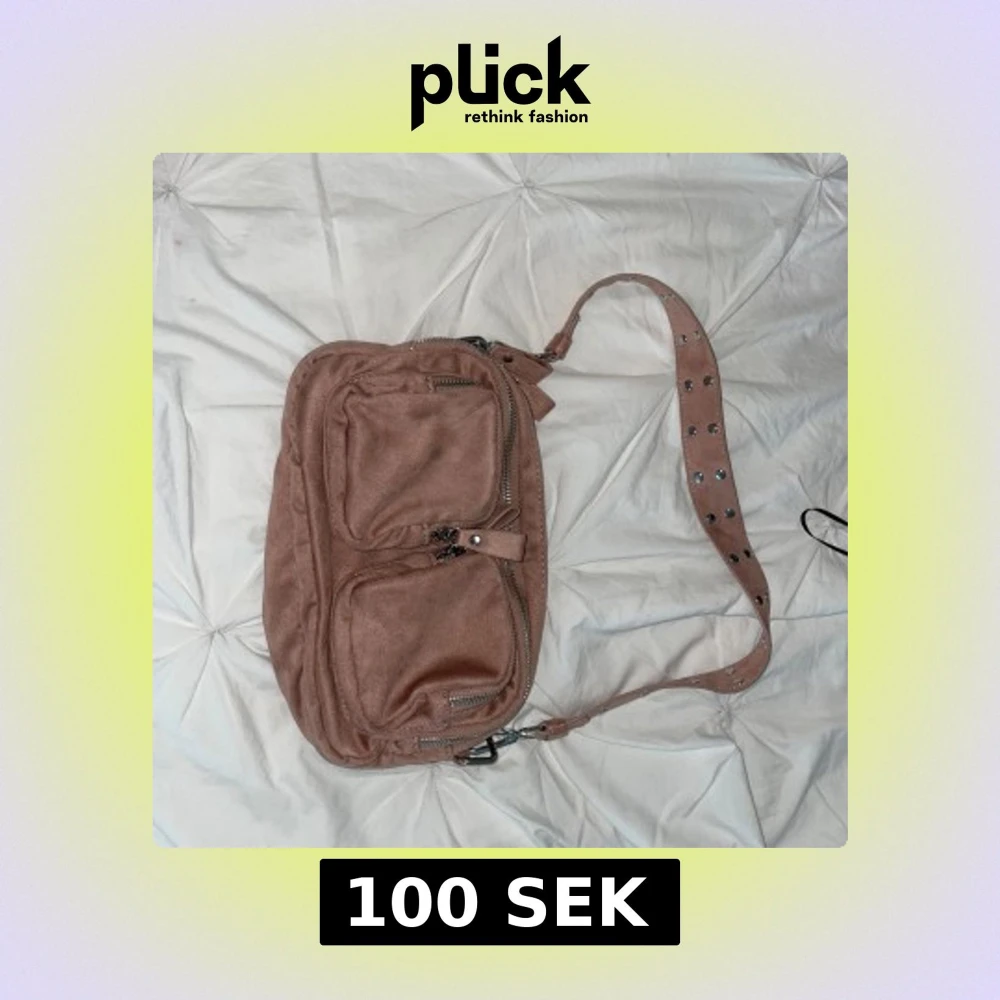 Cool rosa axelväska från Gina Tricot i mockaimitation med bred axelrem dekorerad med silvriga nitar. Väskan har flera fack med dragkedja framtill och är perfekt för att få plats med allt du behöver. Snygg och praktisk design som sticker ut.