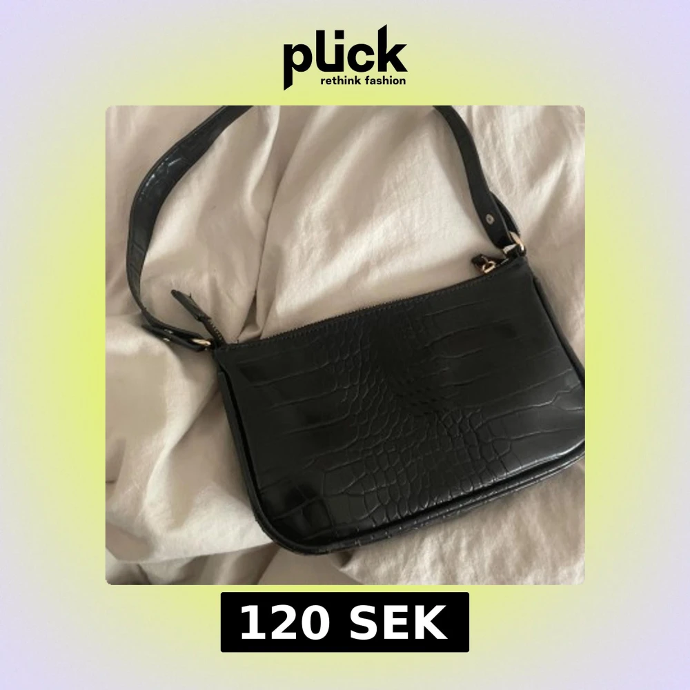 Säljer en svart axelväska i croco-mönstrat skinnimitation. Väskan har en enkel design med dragkedja upptill och justerbart axelband. Perfekt storlek för det viktigaste och passar till många olika outfits.