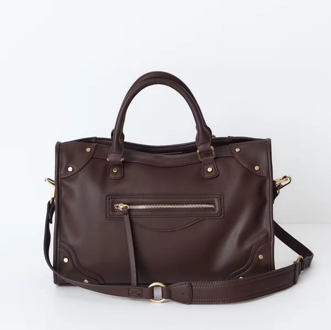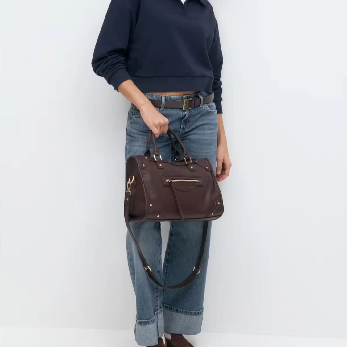 Snygg mörkbrun handväska i skinn med guld detaljer! Stor väska vilket passar perfekt som skolväska🤎