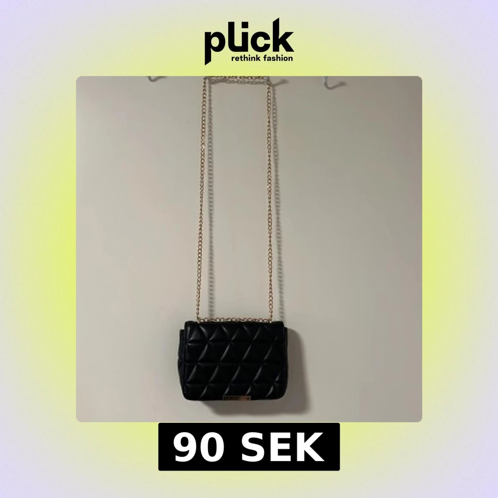 Snygg svart axelväska med quiltat mönster och guldfärgad kedja som axelrem. Perfekt för att lyfta din outfit med en trendig accessoar. Väskan har en stilren och modern design med triangulära detaljer på framsidan.