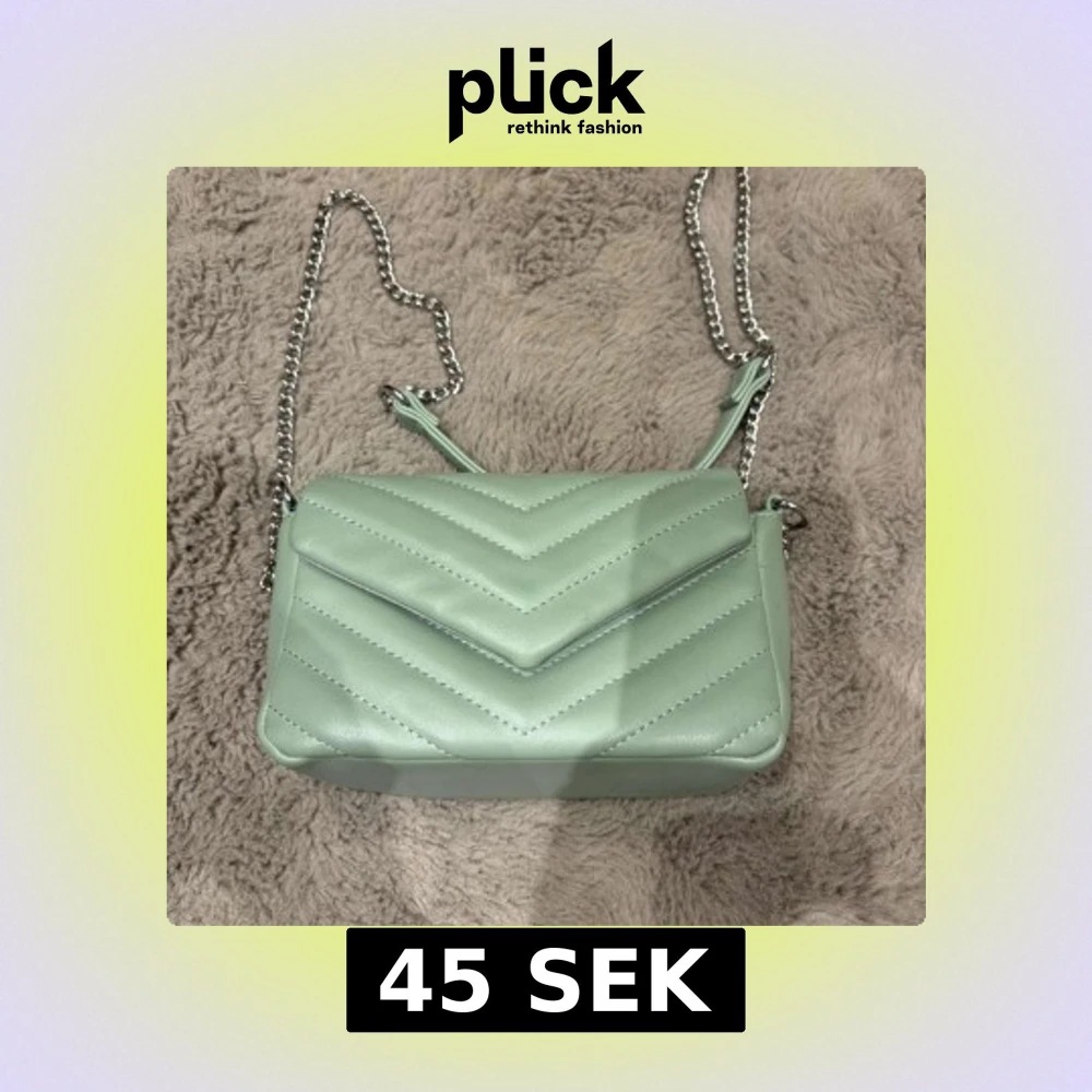 Säljer en ljusgrön axelväska med quiltat mönster och silverfärgad kedjerem. Väskan har ett stilrent V-mönster på locket och flera fack inuti. Perfekt för dig som vill ha en snygg och trendig accessoar till din outfit. Ps lilla fläcken är borta!