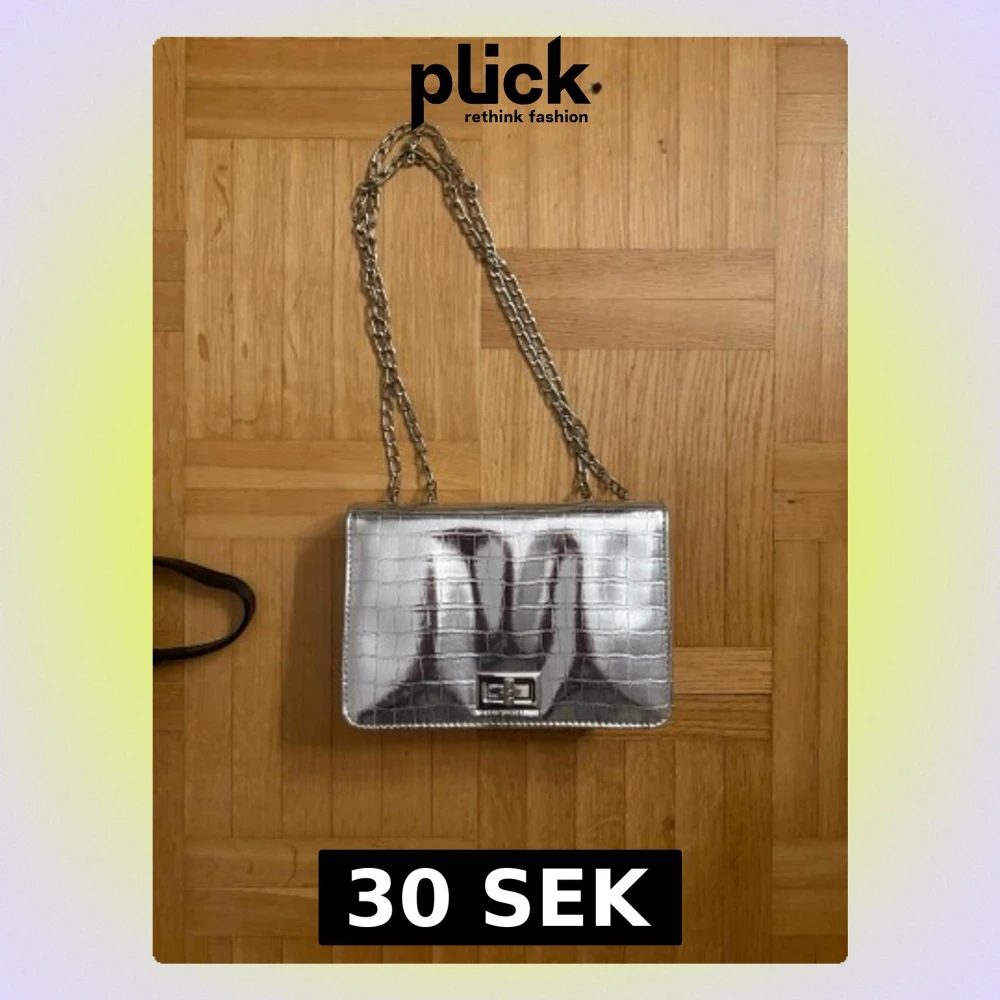 Snygg handväska i metallic silver med krokodilpräglat mönster och kedjerem. Väskan har ett stilrent spänne framtill och en boxig form som ger en modern look. Perfekt accessoar för att lyfta din outfit.