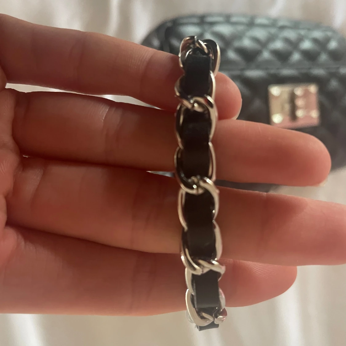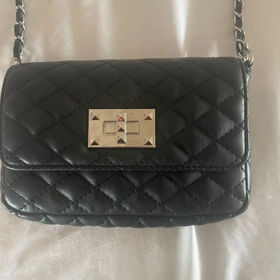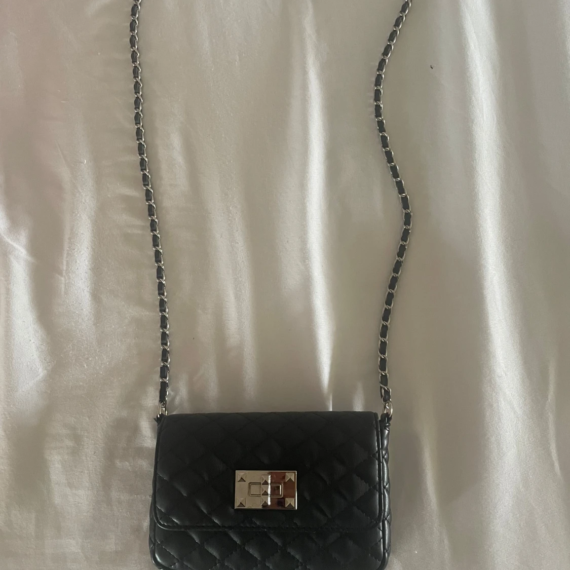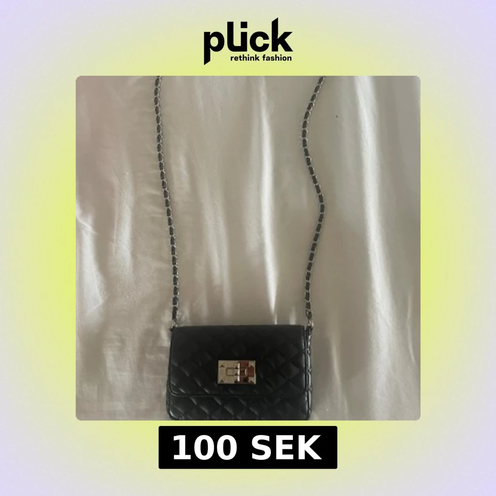 Säljer en svart quiltad axelväska med silverfärgad kedjerem och snyggt spänne framtill. Väskan har klassisk design med rutmönster och är tillverkad i skinnimitation. Perfekt storlek för det viktigaste och ger en lyxig vibe till din outfit.
