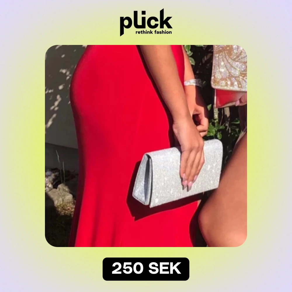 Glittrig kuvertväska. Använd vid 1 tillfälle så i stort sett i nyskick. Medföljer en liten silvrig kedja om man vill ha den hängande istället för i handen.