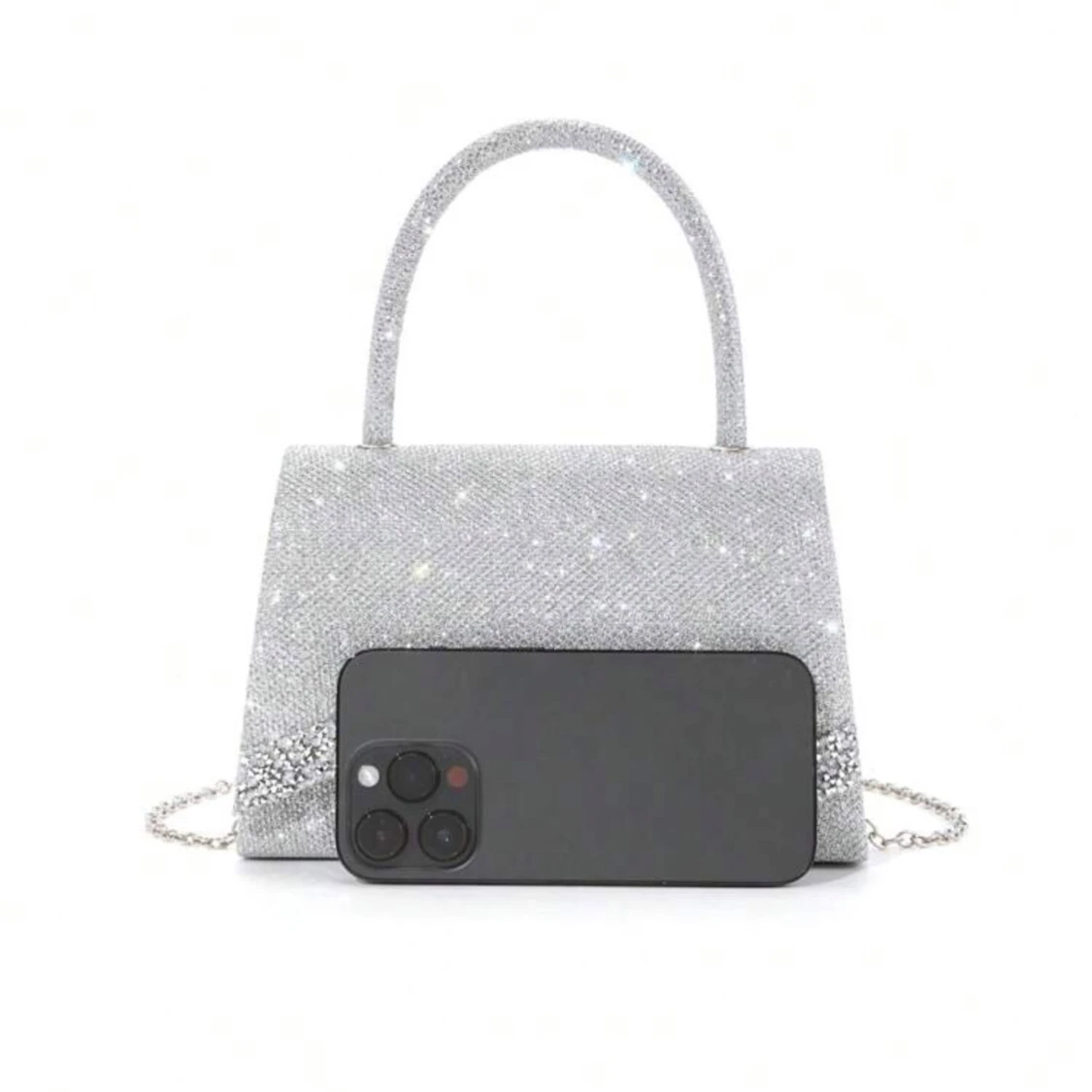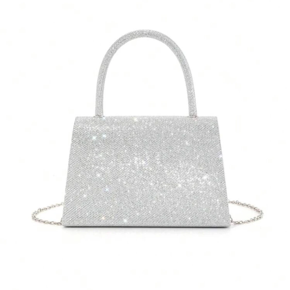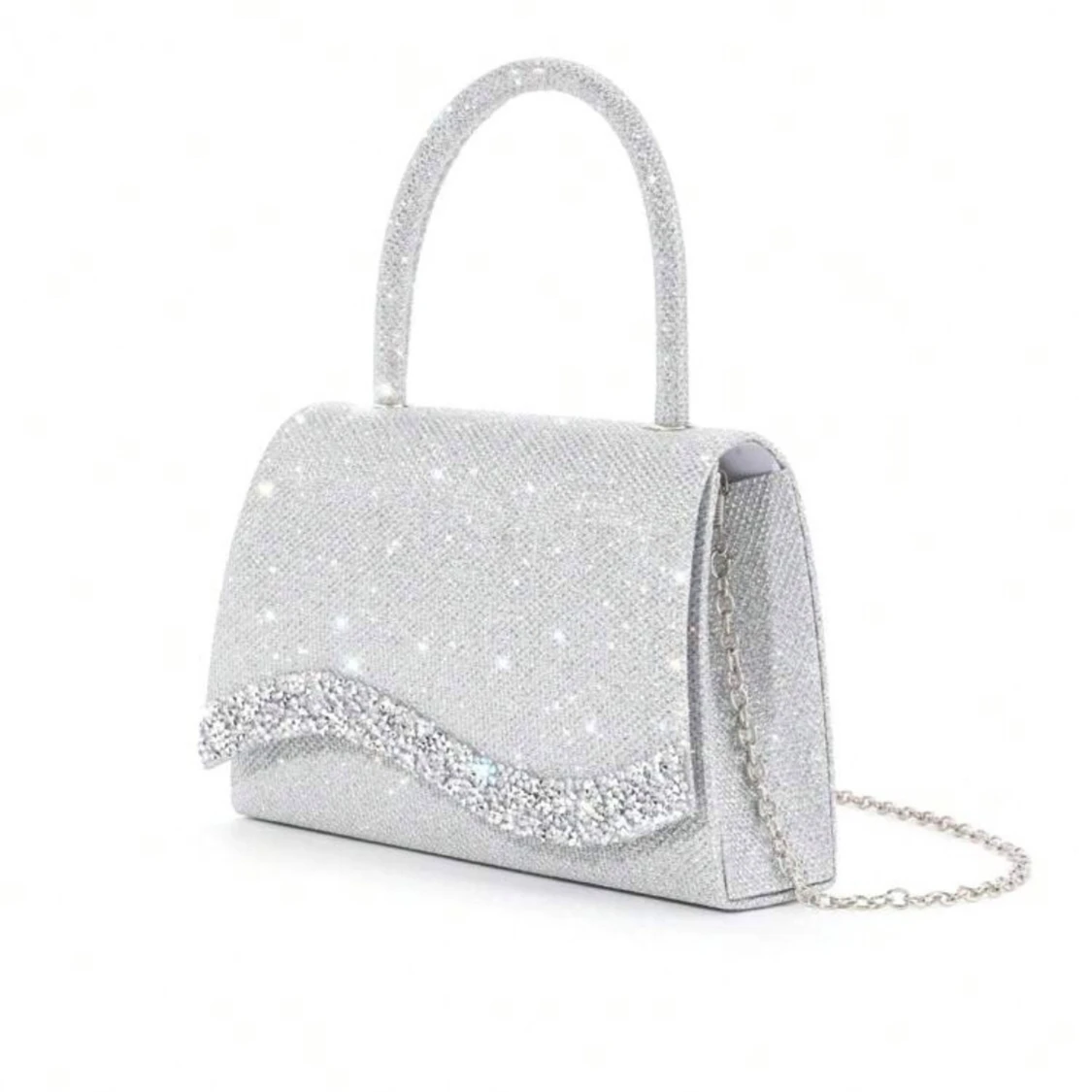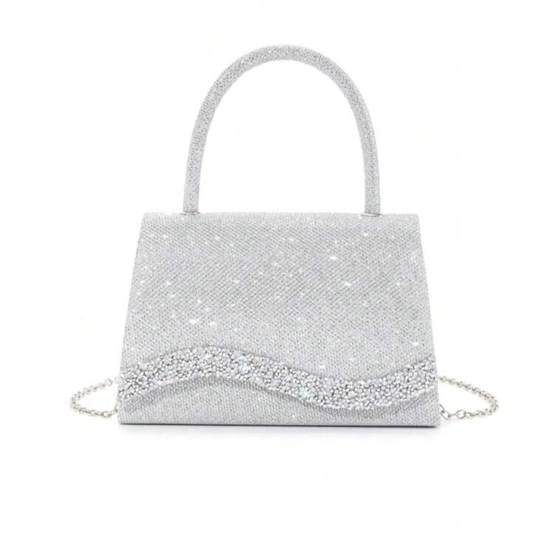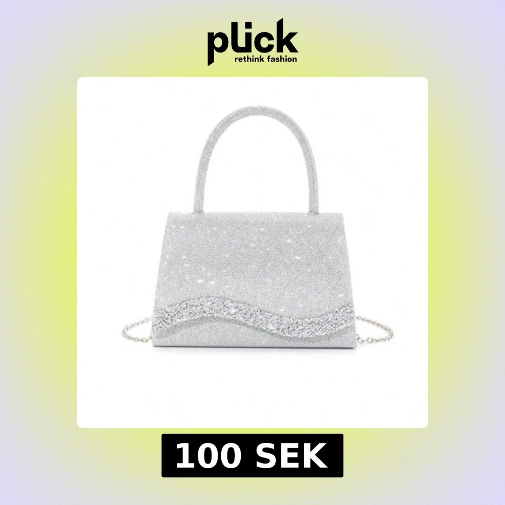 Superfin handväska i silver med glittrande yta och en vågig detalj av paljetter på framsidan. Väskan har ett stadigt handtag och en tunn kedja som axelrem. Perfekt storlek för mobilen och det viktigaste. Snygg och unik design som verkligen sticker ut.