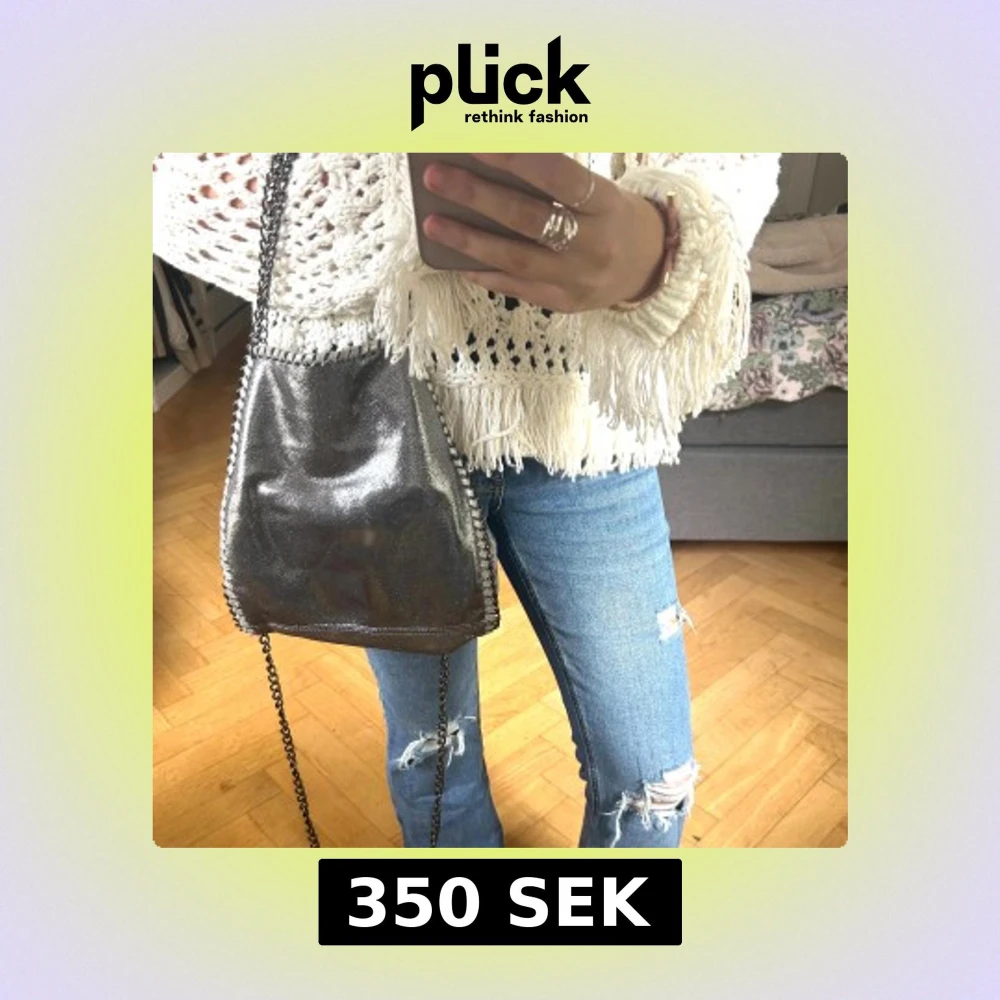 Snygg axelväska i glittrigt silver med kedja som axelrem och coola detaljer längs kanterna. Väskan har en mjuk form och passar perfekt för att lyfta din outfit med lite extra shine. Perfekt storlek för mobil, plånbok och småsaker.påminner om Stella mccartney väskan💓💓