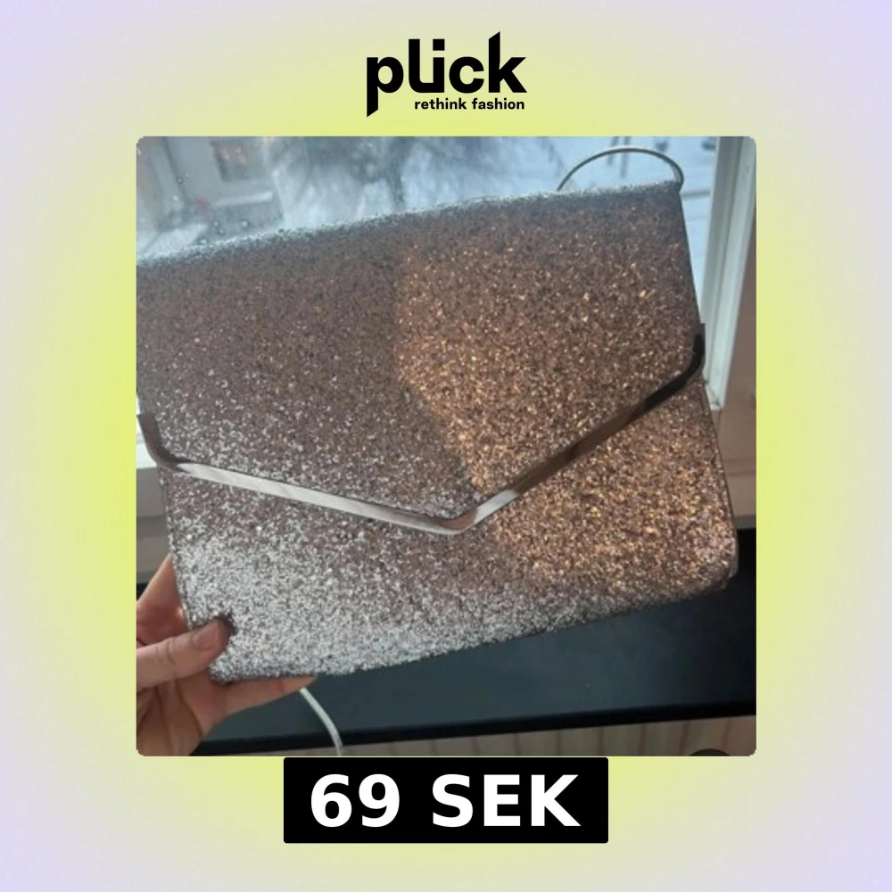 Snygg och glittrig kuvertväska i silver med en axelrem. Väskan har en praktisk magnetknäppning och ett rymligt fack inuti. Använd en gång.